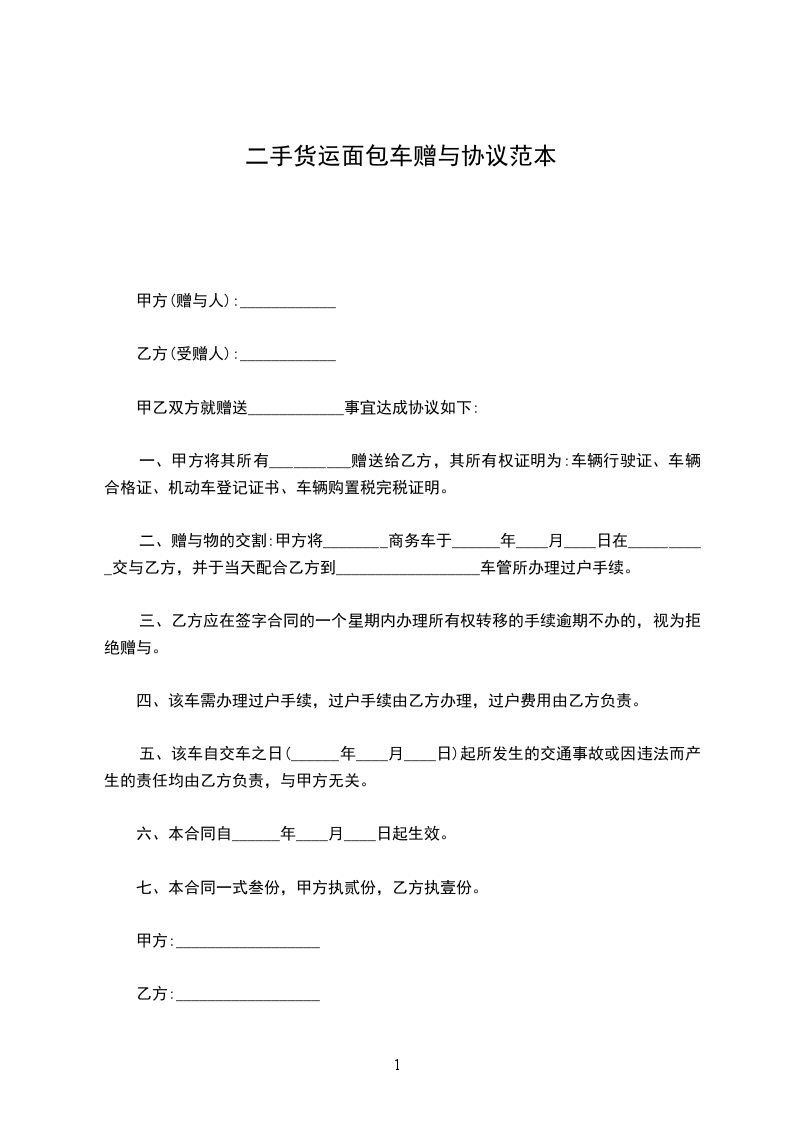 二、赠与物的交割:甲方将________商务车于______年____月____日在__________交与乙方,并于当天配合乙方到__________________车管所办理过户手续。