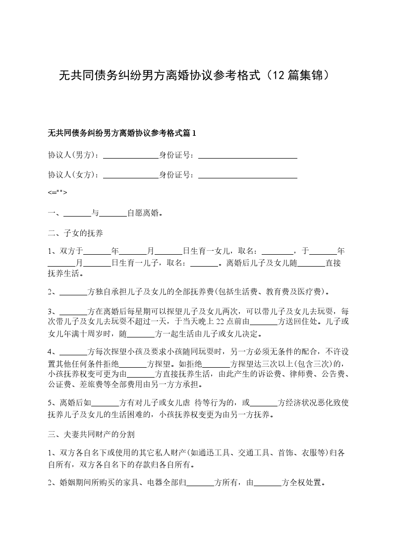 无共同债务纠纷男方离婚协议参考格式篇12