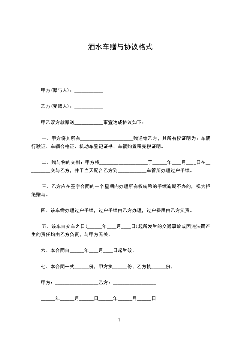 一、甲方将其所有__________赠送给乙方,其所有权证明为:车辆行驶证、车辆合格证、机动车登记证书、车辆购置税完税证明。