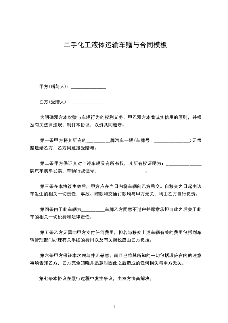 一、甲方将其所有__________赠送给乙方,其所有权证明为:车辆行驶证、车辆合格证、机动车登记证书、车辆购置税完税证明。