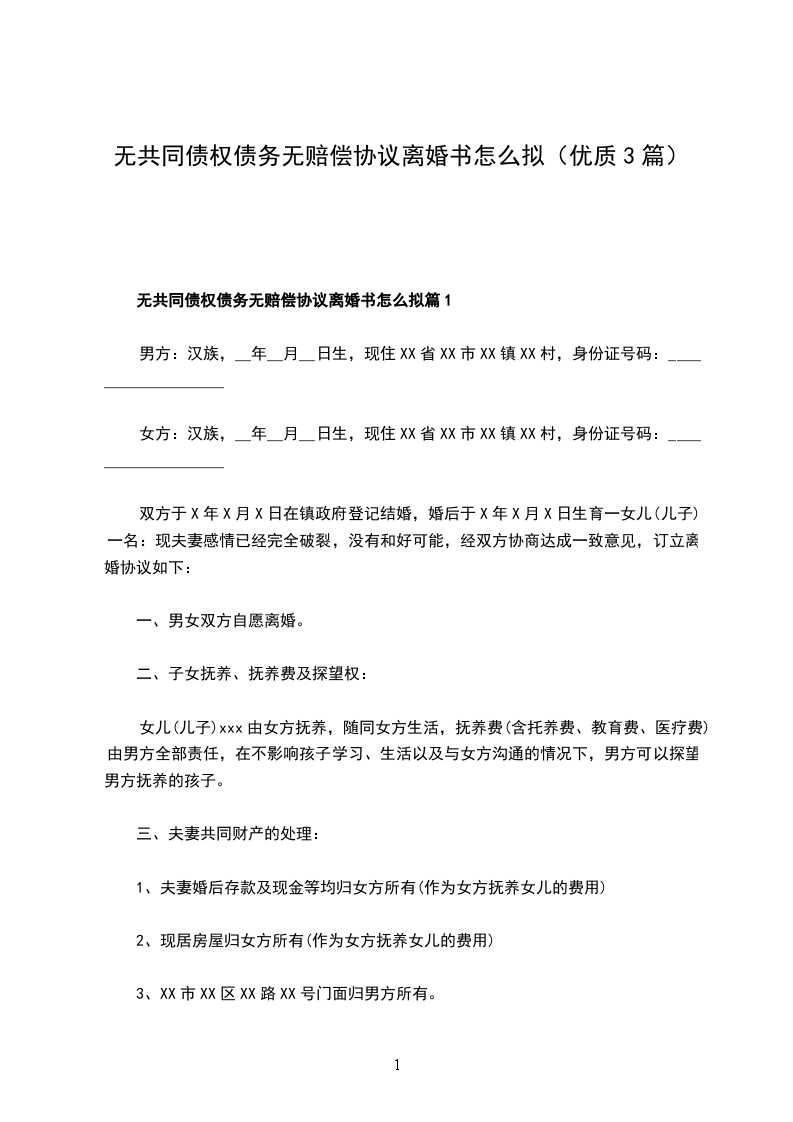 无共同债权债务无赔偿协议离婚书怎么拟篇1