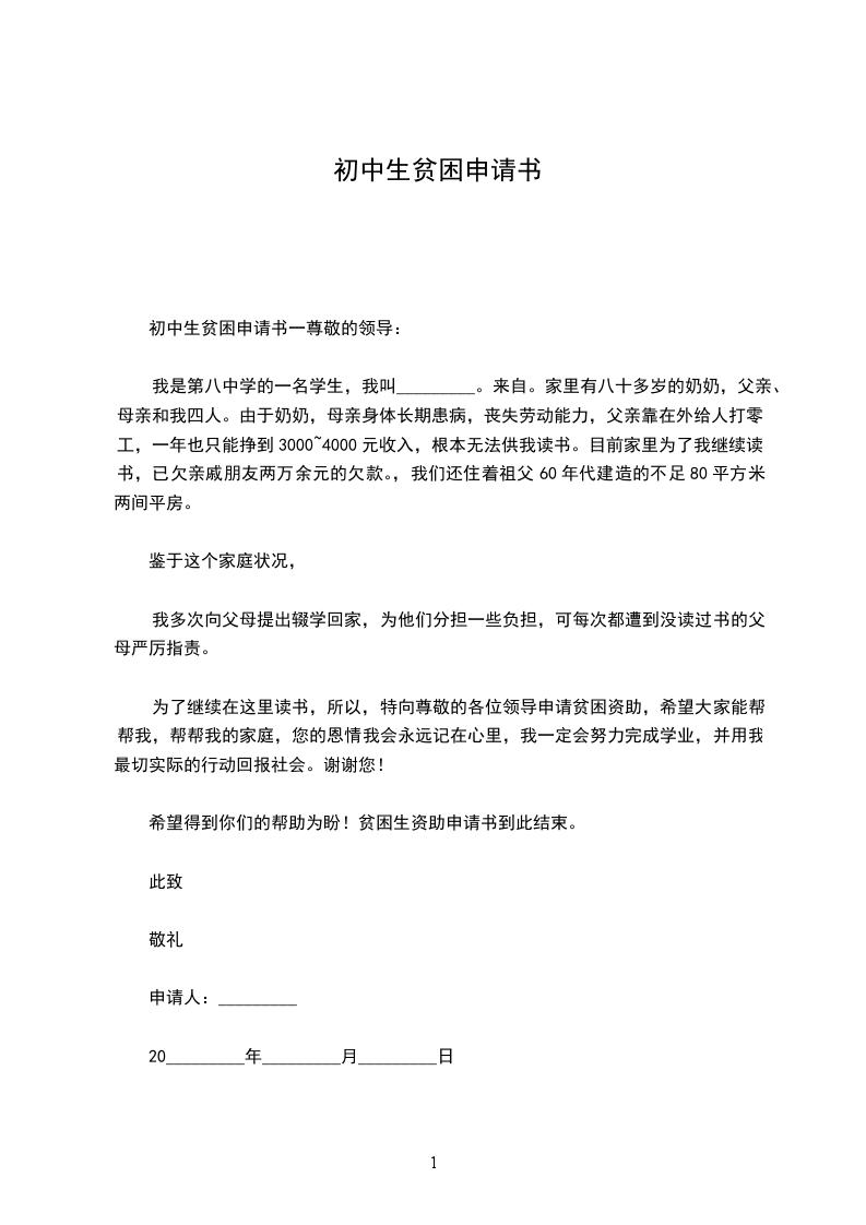 您好!我是_________年级_________班的学生,_________户口,家有四口人,爸爸、妈妈、奶奶和我。我家境贫困,家庭经济收入全靠父母的辛苦工作,妈妈是打零工的,爸爸虽然有工作,但工资并不是很高,一个月家庭总收入才3000元不到!我们全家人一直都很节省,可仅靠这点微薄的收入,维持全家人的生活还是有些困难。最近,妈妈在工作中,手受了伤,所以家里的经济条件更困难了。我很想为家里承担一些负担,所以为了让爸妈少操心,我一直都很努力地学习,可我现在始终是一名初中生,心有余而力不足。所以,我想申请国家贫困生助学金!希望能给予我一定的帮助。