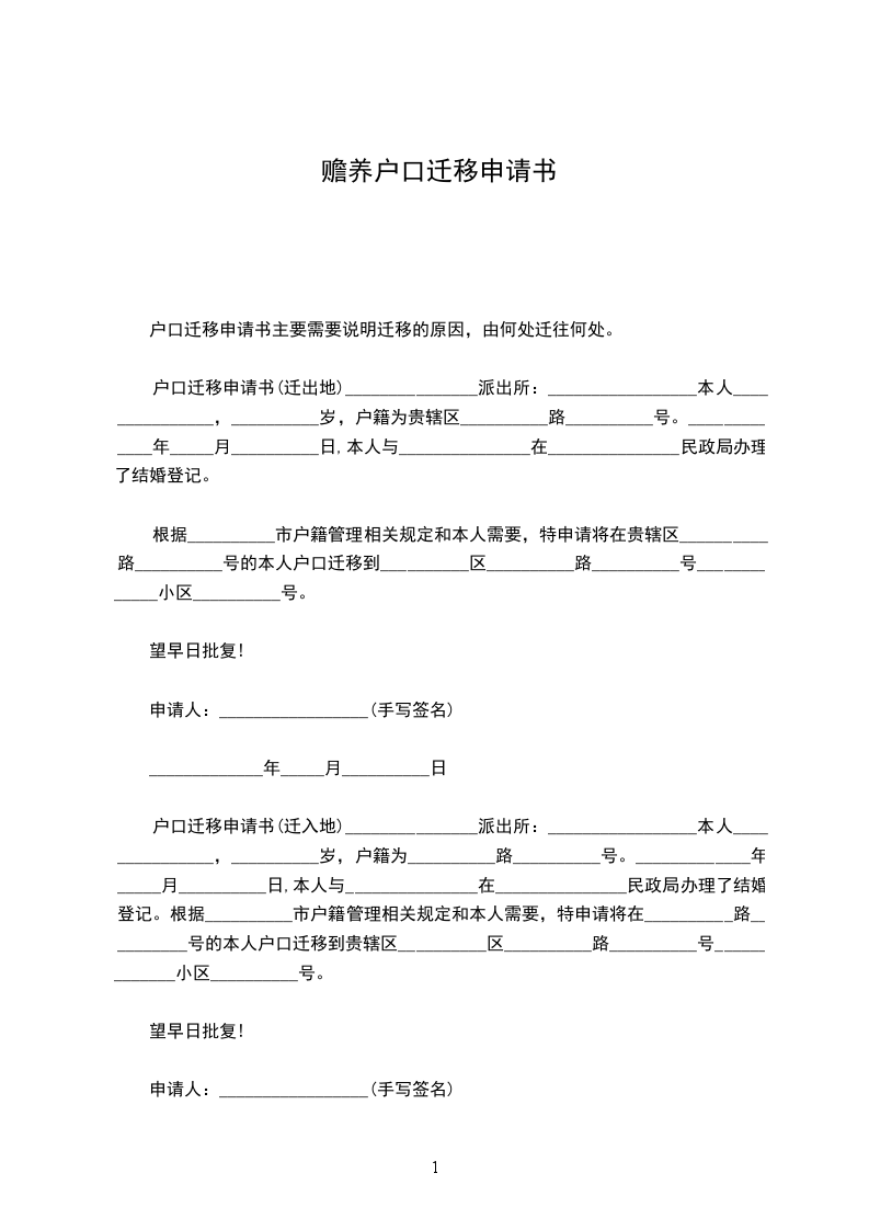 户口迁移申请书(迁出地)_______________派出所:_________________本人_______________,__________岁,户籍为贵辖区__________路__________号。_____________年_____月__________日,本人与_______________在_______________民政局办理了结婚登记。
