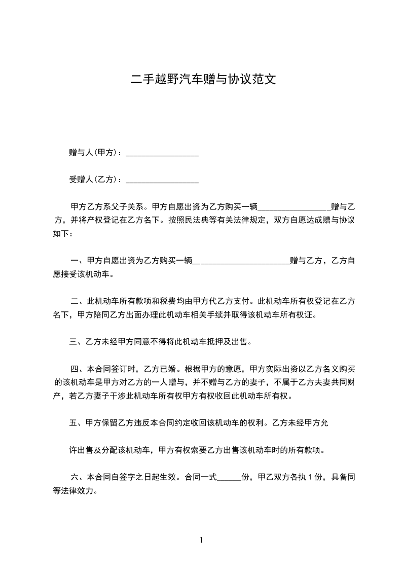 一、甲方将其所有__________赠送给乙方,其所有权证明为:车辆行驶证、车辆合格证、机动车登记证书、车辆购置税完税证明。