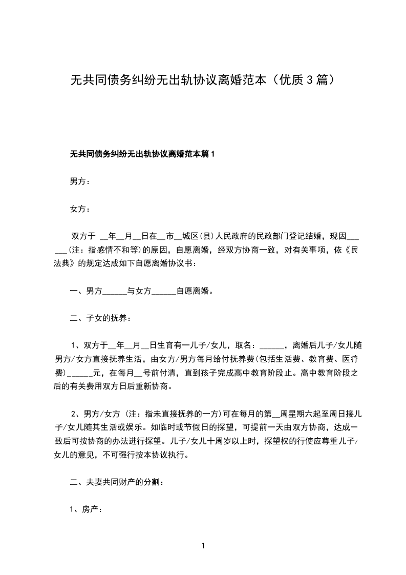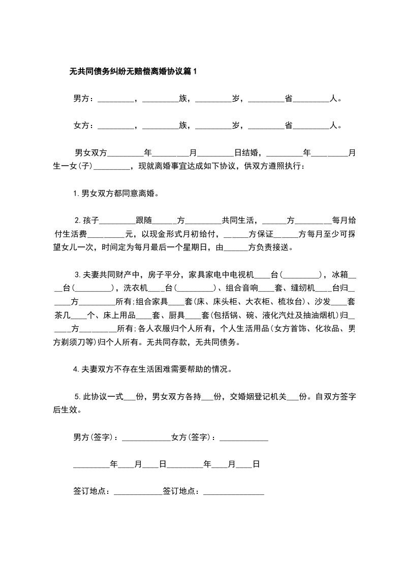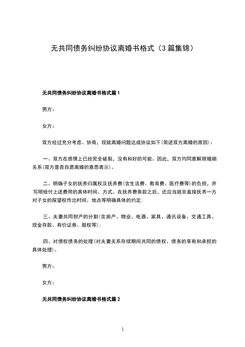 1、甲乙双方确认在婚姻关系存续期间无发生的共同债务。