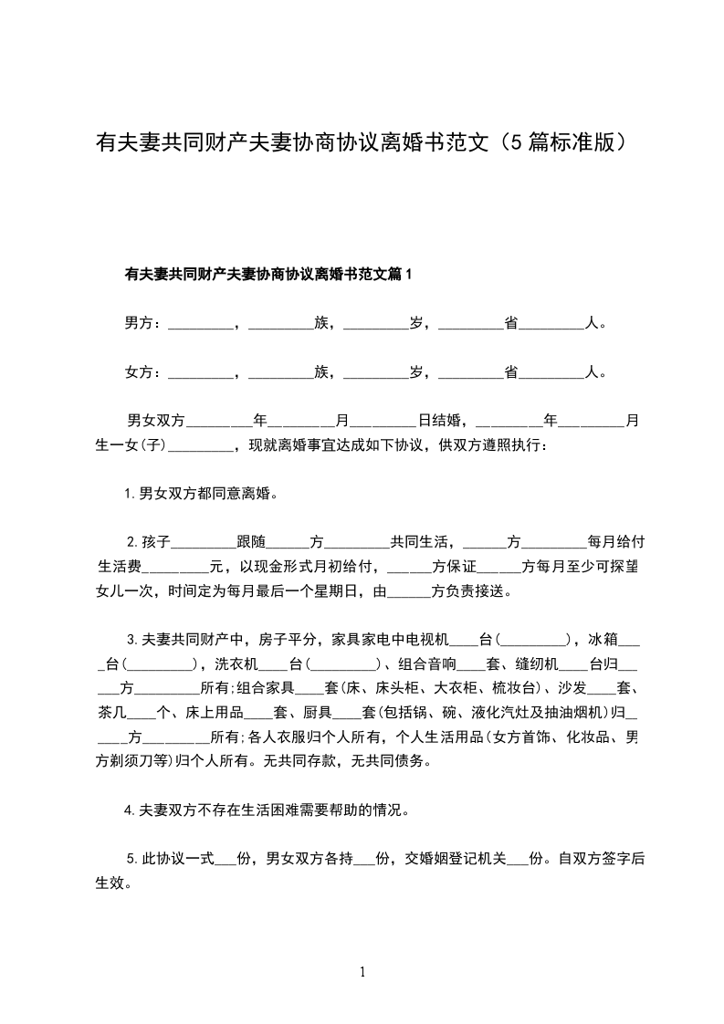 5.此协议一式___份,男女双方各持___份,交婚姻登记机关___份。自双方签字后生效。