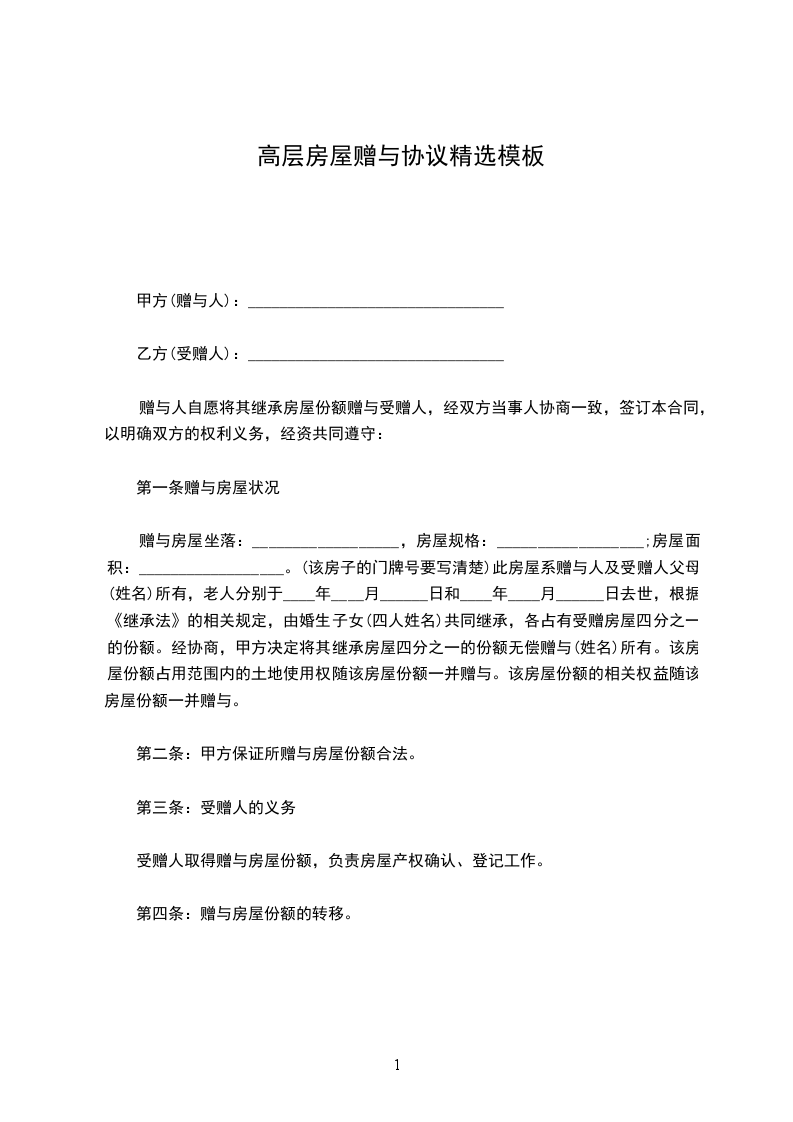 赠与房屋坐落:__________________,房屋规格:__________________;房屋面积:__________________。(该房子的门牌号要写清楚)此房屋系赠与人及受赠人父母(姓名)所有,老人分别于____年____月______日和____年____月______日去世,根据《继承法》的相关规定,由婚生子女(四人姓名)共同继承,各占有受赠房屋四分之一的份额。经协商,甲方决定将其继承房屋四分之一的份额无偿赠与(姓名)所有。该房屋份额占用范围内的土地使用权随该房屋份额一并赠与。该房屋份额的相关权益随该房屋份额一并赠与。