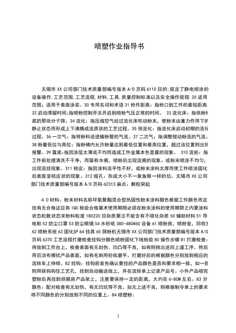 无锡市XX公司部门技术质量部编号版本A/O页码6110目的:规定了静电喷涂的设备操作,工艺范围,工艺流程,材料,工具,质量控制标准以及安全操作规程.20适用范围;适用于表面涂装。30专用名词和术语31枪件距离:指枪口到工件的最短距离。32启动滞留时间:指喷粉控制开关开启到喷粉气压正常的时间。33流化床:指供粉桶底的那块分子筛。34流化:指压缩空气经过流化床吹动粉末,使粉末由重力作用下的静止状态而形成上下沸腾成流质状的工艺过程。35预流化:指流化床启动初期的流化过程。36一次气:指将粉料送进输粉管的气流。37二次气;指调整搅动粉流的气流。38粉量低位与高位:指粉桶内允许粉量达到最低位置和最高位置,超过该位置则出现报警。39露底:指因涂层太薄或不均而造成工件金属本色显露的现象。310流疤:指工件前处理清洗不干净,而留有水痕,喷粉后出现流痕的现象。或粉末喷涂不均匀,出现流挂现象。311桔皮:指因涂料流平性不好,或粉末涂料太厚而使工件喷涂固化后表面呈桔皮状的现象。312缩孔:形成大小不一象鱼眼一样的坑。无锡市XX公司部门技术质量部编号版本A/O页码62313麻点:颗粒突起