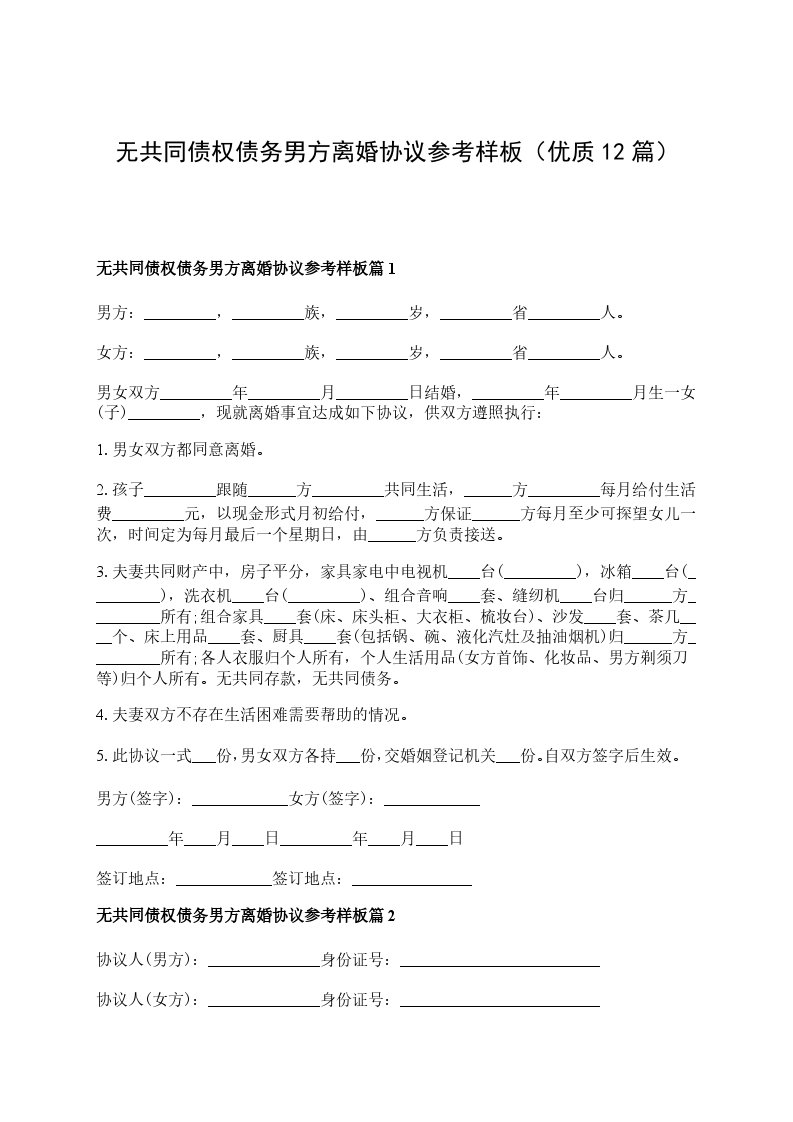 无共同债权债务男方离婚协议参考样板篇12