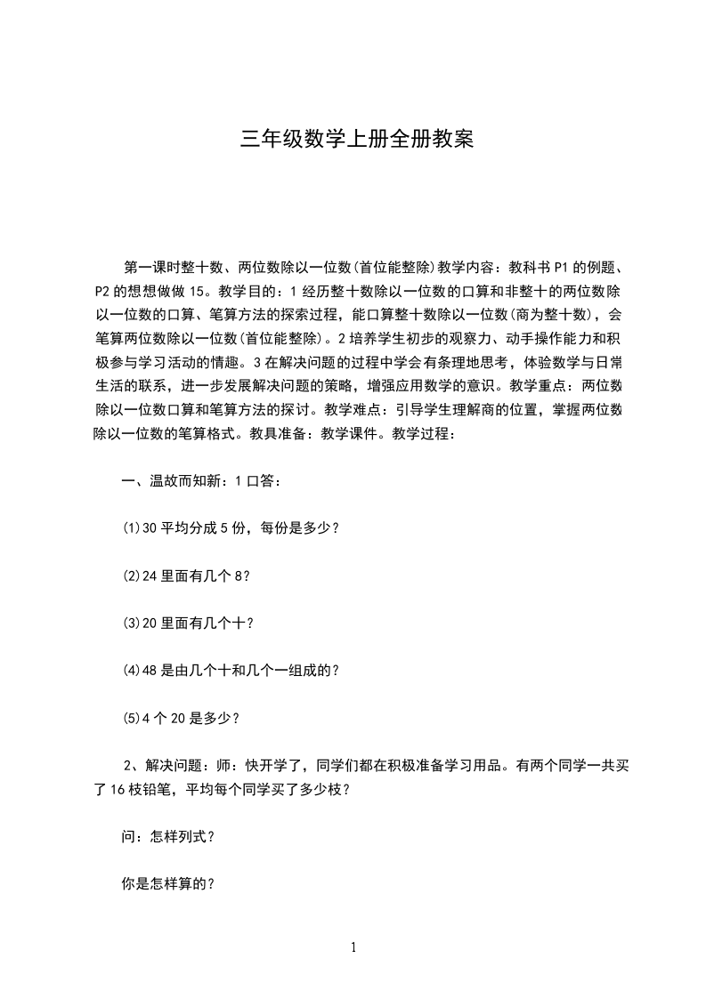 第一课时整十数、两位数除以一位数(首位能整除)教学内容:教科书P1的例题、P2的想想做做15。教学目的:1经历整十数除以一位数的口算和非整十的两位数除以一位数的口算、笔算方法的探索过程,能口算整十数除以一位数(商为整十数),会笔算两位数除以一位数(首位能整除)。2培养学生初步的观察力、动手操作能力和积极参与学习活动的情趣。3在解决问题的过程中学会有条理地思考,体验数学与日常生活的联系,进一步发展解决问题的策略,增强应用数学的意识。教学重点:两位数除以一位数口算和笔算方法的探讨。教学难点:引导学生理解商的位置,掌握两位数除以一位数的笔算格式。教具准备:教学课件。教学过程: