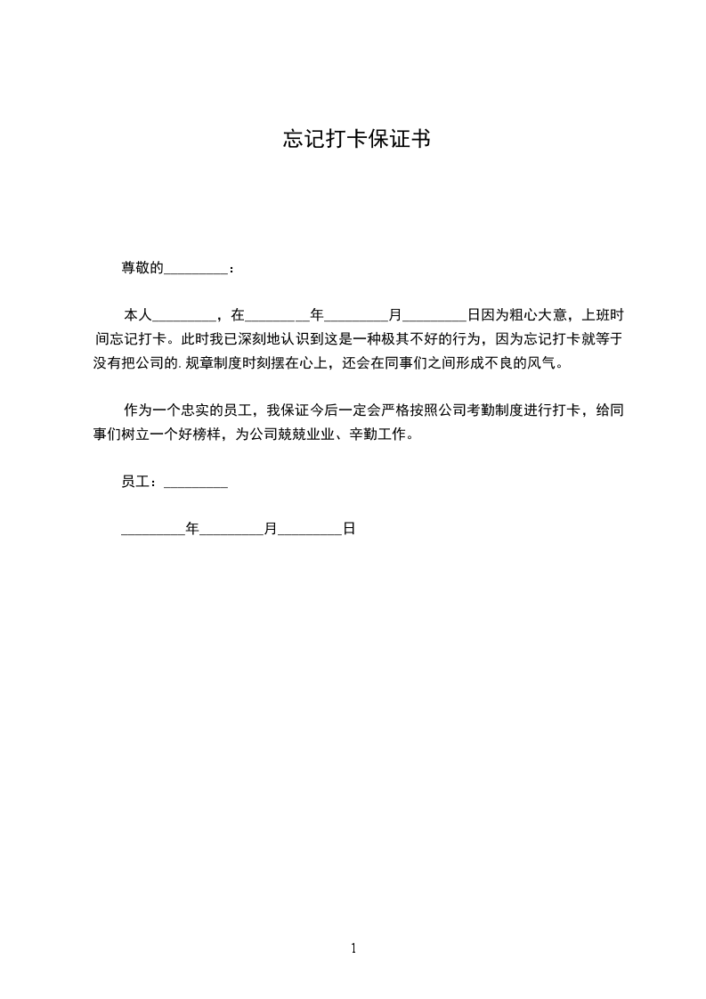 本人_________,在_________年_________月_________日因为粗心大意,上班时间忘记打卡。此时我已深刻地认识到这是一种极其不好的行为,因为忘记打卡就等于没有把公司的.规章制度时刻摆在心上,还会在同事们之间形成不良的风气。