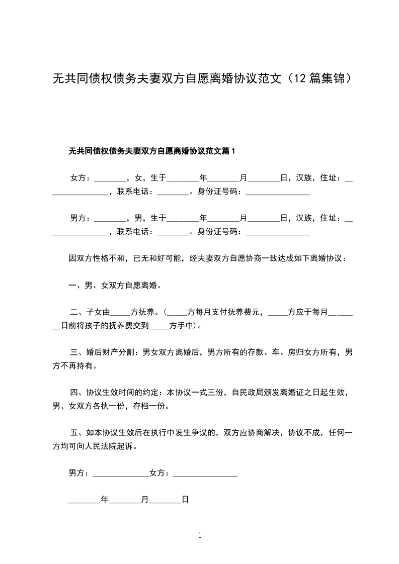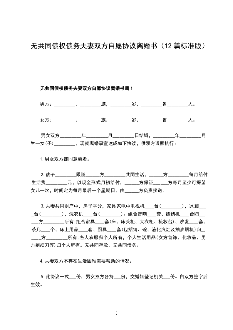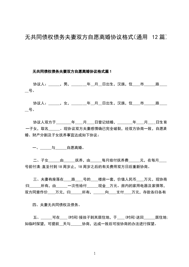 无共同债权债务夫妻双方自愿协议离婚范本格式篇12