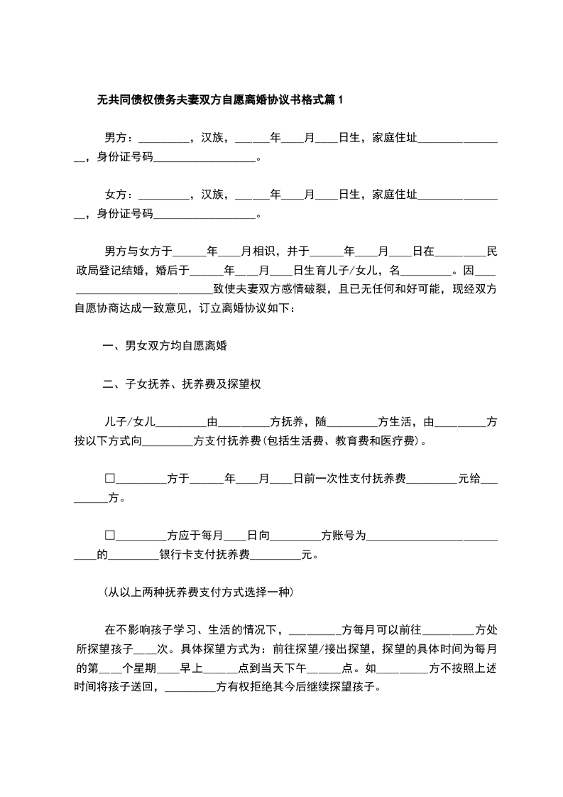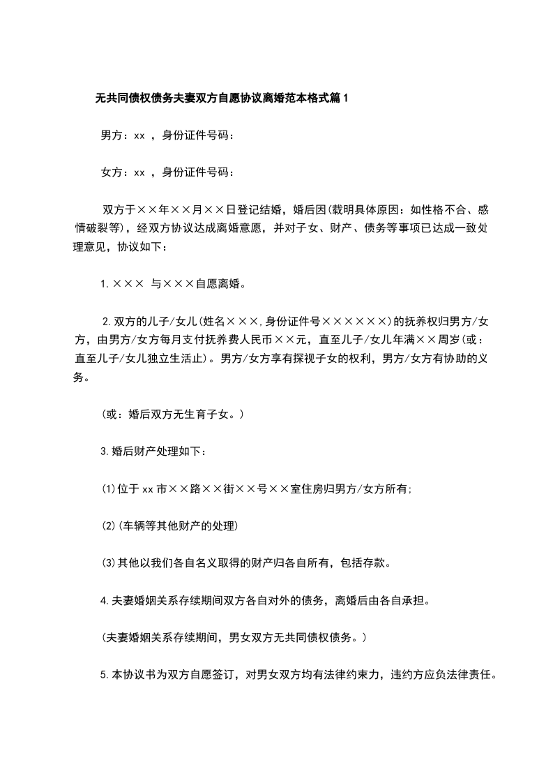 无共同债权债务夫妻双方自愿协议离婚范本格式篇10