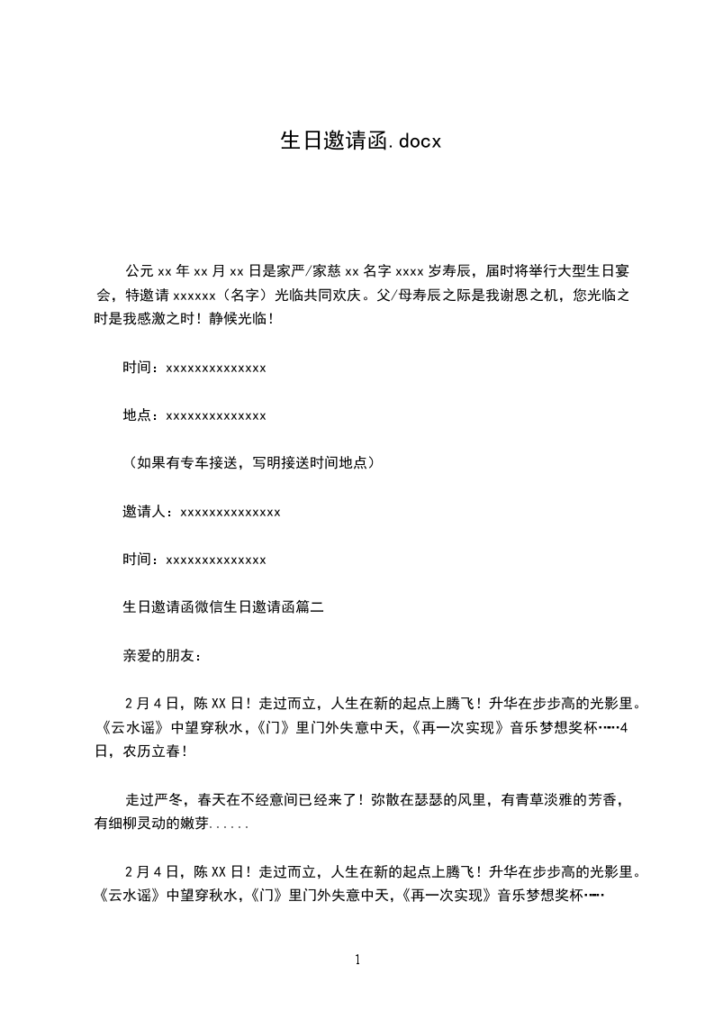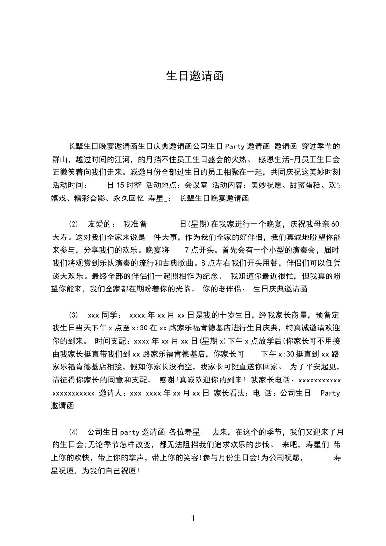 (3) xxx同学: xxxx年xx月xx日是我的十岁生日,经我家长商量,预备定 我生日当天下午x点至x:30在xx路家乐福肯德基店进行生日庆典,特真诚邀请欢迎你的到来。 时间支配:xxxx年xx月xx日(星期x)下午x点放学后(你家长可不用接)由我家长挺直带我们到xx路家乐福肯德基店,你家长可 下午x:30挺直到xx路家乐福肯德基店相接,假如你家长没有空,我家长可挺直送你回家。 为了平安起见,请征得你家长的同意和支配。 感谢!真诚欢迎你的到来! 我家长电话:xxxxxxxxxxx xxxxxxxxxxx 邀请人:xxx xxxx年xx月xx日 家长看法: 电 话: 公司生日Party邀请函