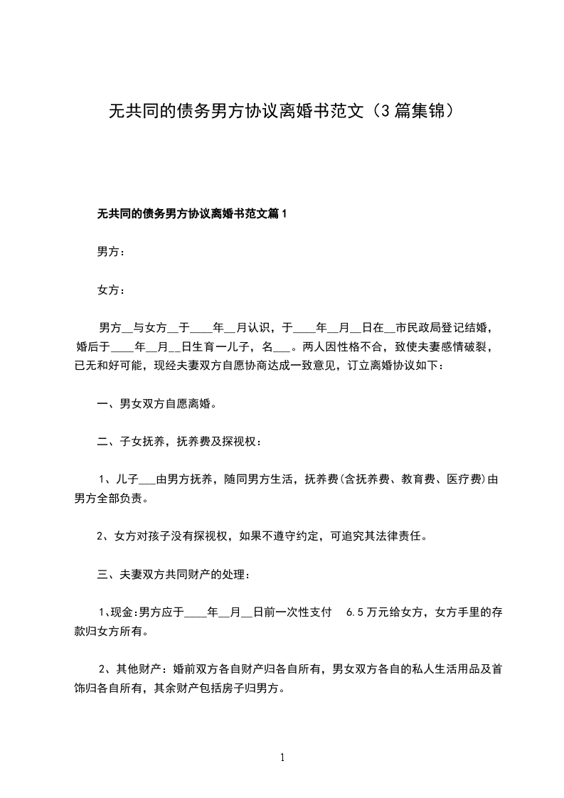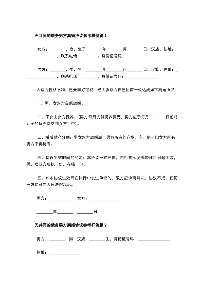 无共同债权债务男方协议离婚范本如何写篇3