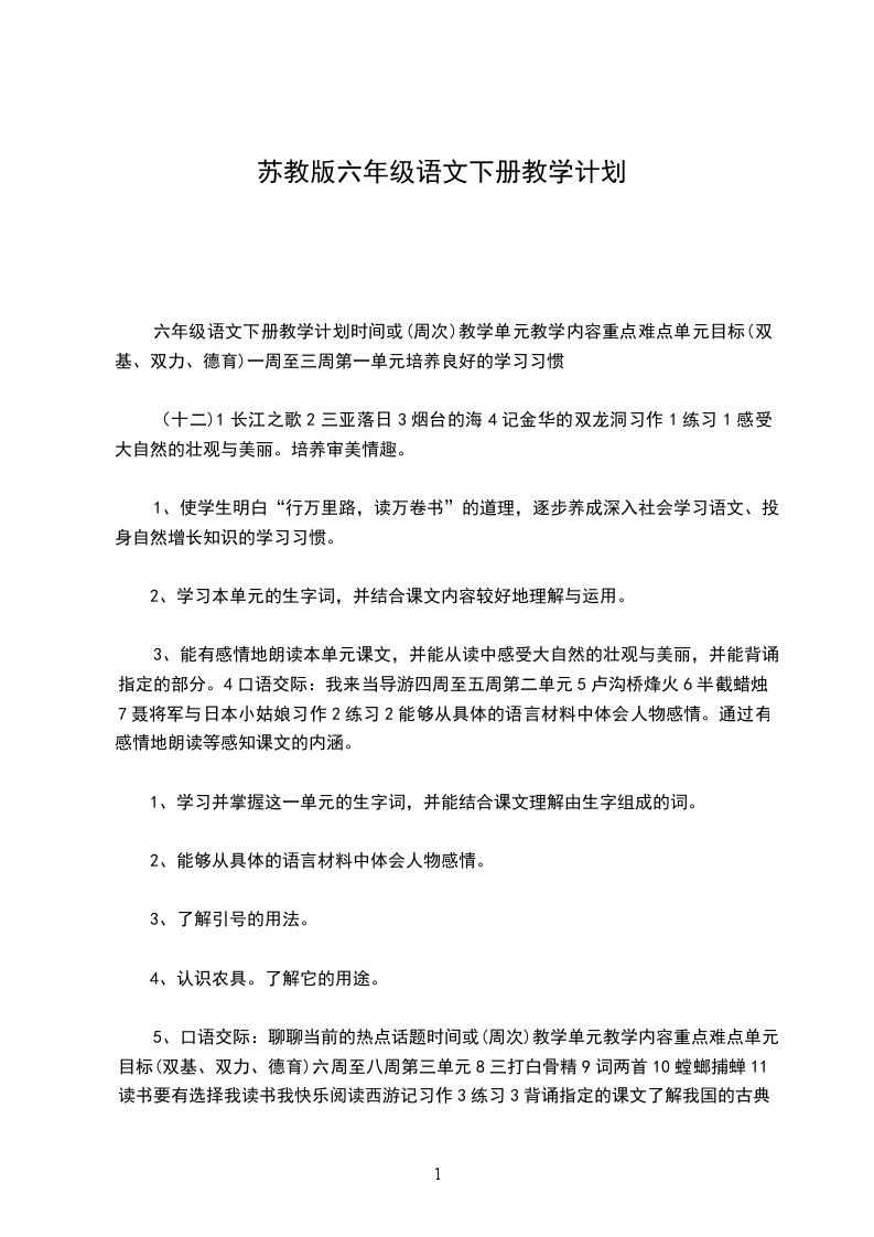 六年级语文下册教学计划时间或(周次)教学单元教学内容重点难点单元目标(双基、双力、德育)一周至三周第一单元培养良好的学习习惯