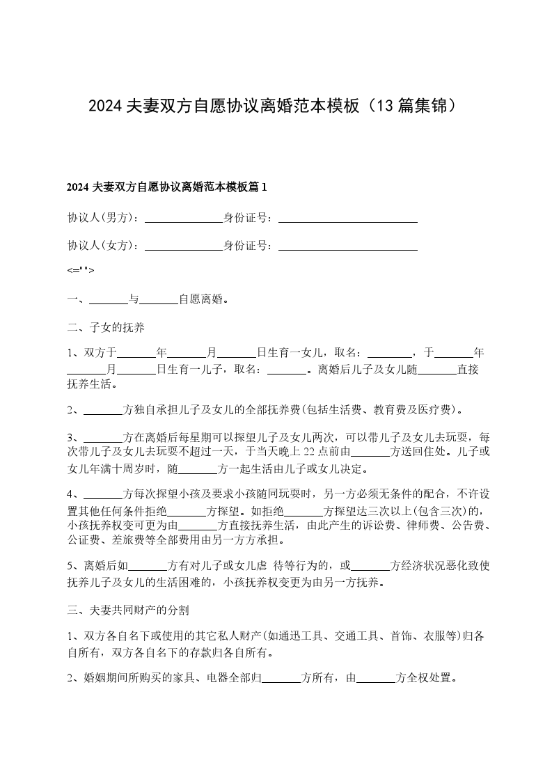 协议人双方于_______年_______月_______日登记结婚,_______年_______月_______日生育一子,取名_______。现协议双方夫妻感情确已完全破裂,经双方协商一致,自愿离婚、财产分割及子女抚养事宜达成如下协议: