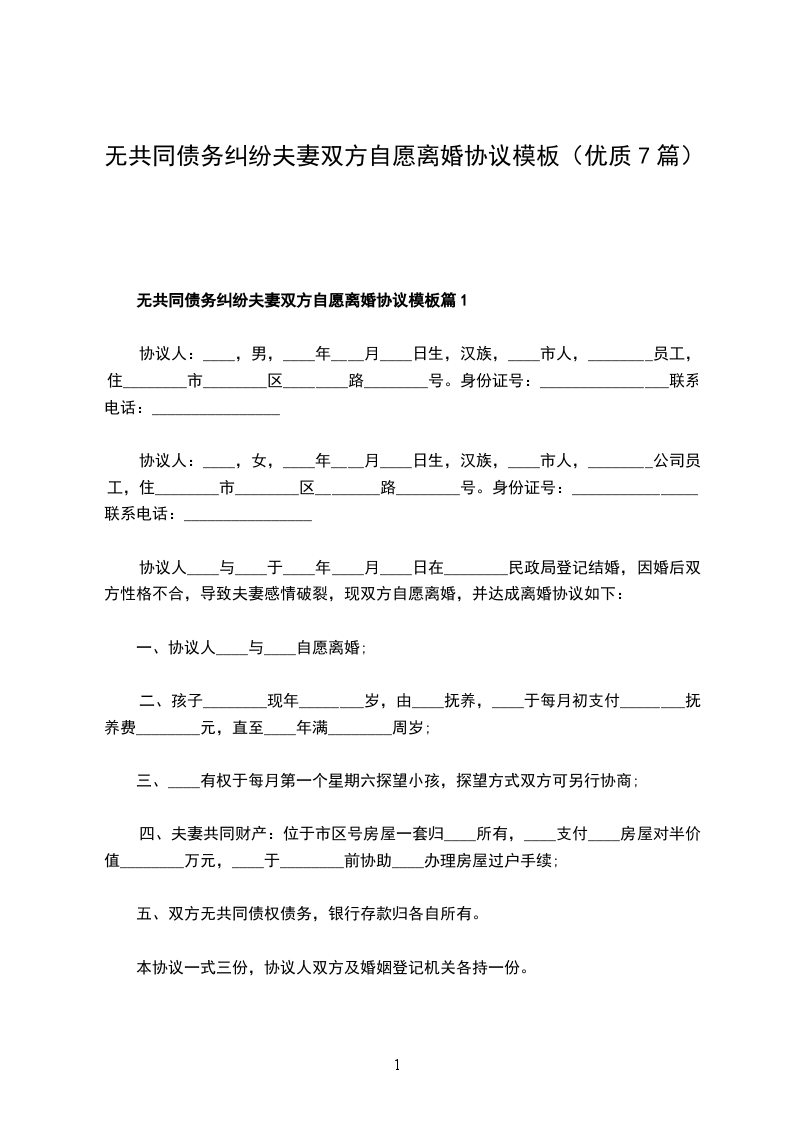 无共同债权夫妻双方自愿离婚协议书参考样例篇7