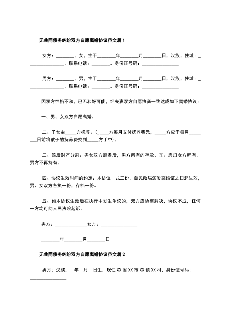 无共同债务纠纷夫妻双方自愿离婚协议书怎么写篇5