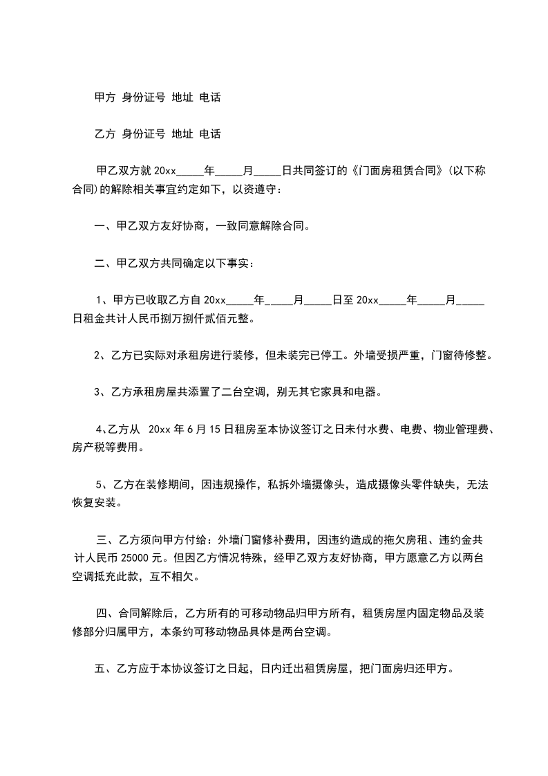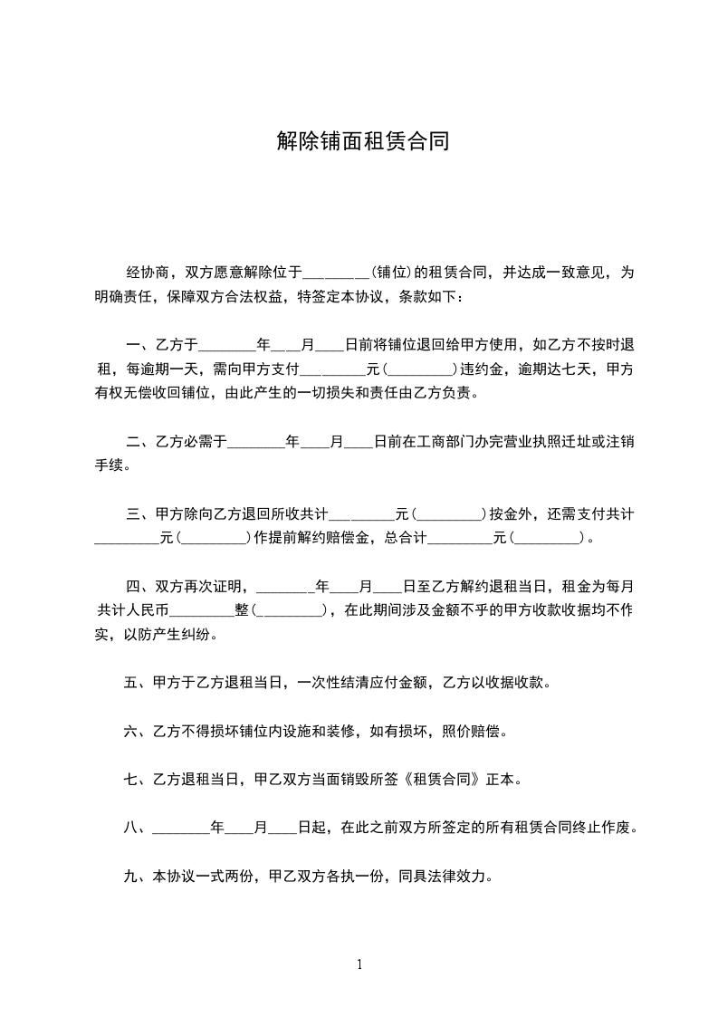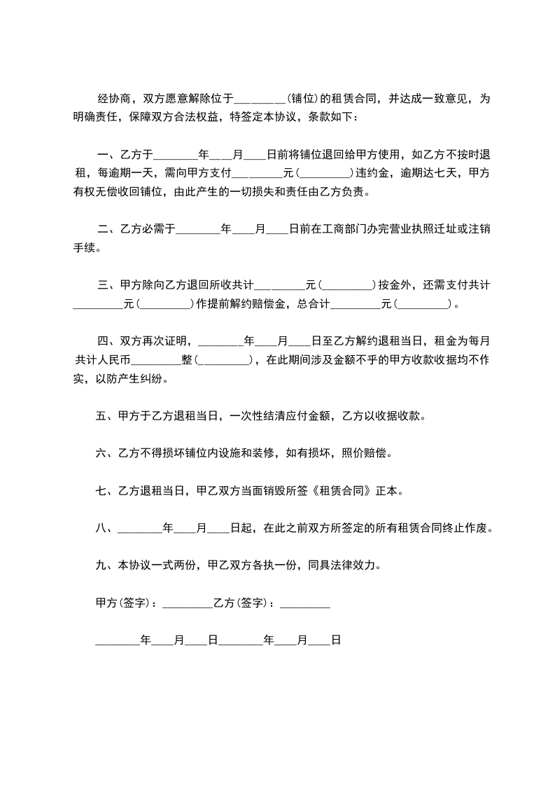 经协商,双方愿意解除位于_________(铺位)的租赁合同,并达成一致意见,为明确责任,保障双方合法权益,特签定本协议,条款如下: