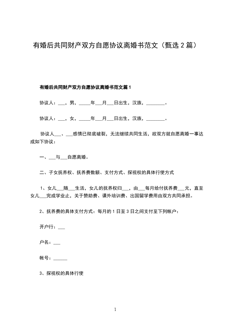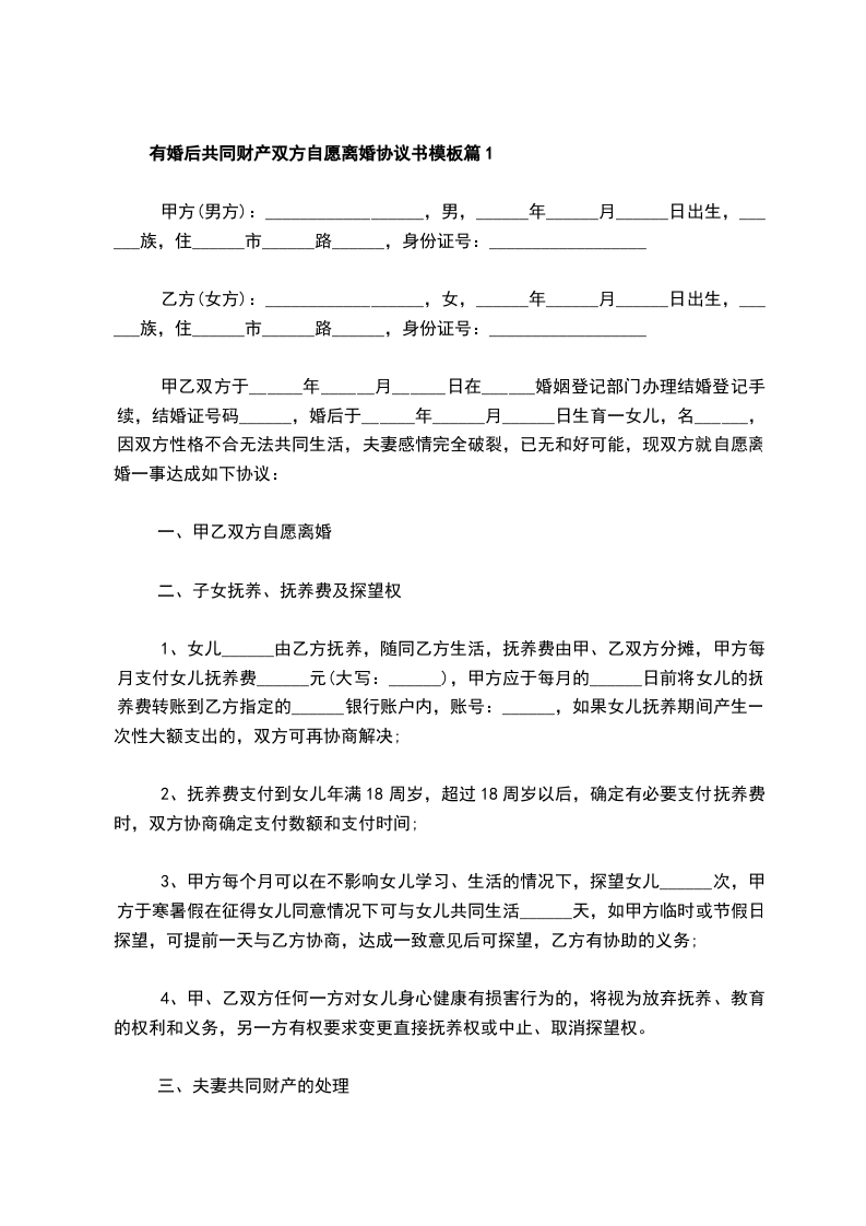 有婚后共同财产双方自愿协议离婚书范文篇2