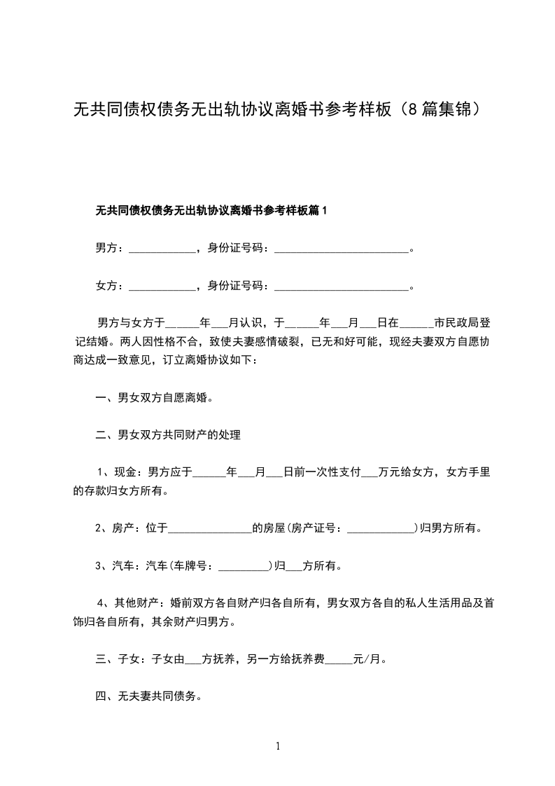 无共同债权债务无出轨协议离婚书参考样板篇8