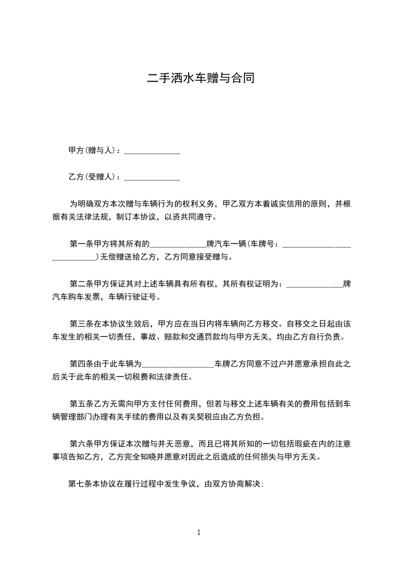 第一条甲方将其所有的______________牌汽车一辆(车牌号:____________________________)无偿赠送给乙方,乙方同意接受赠与。