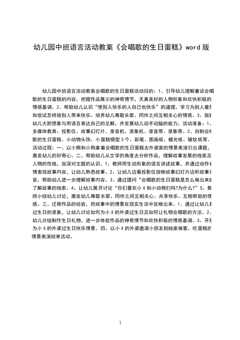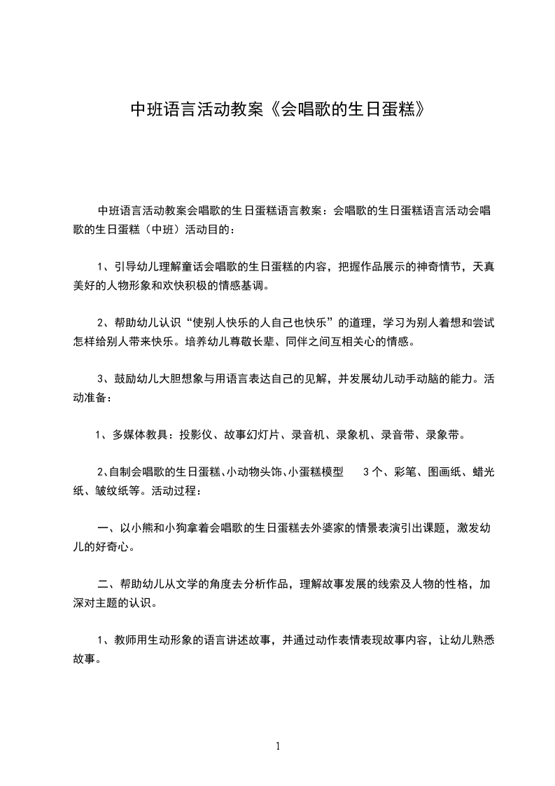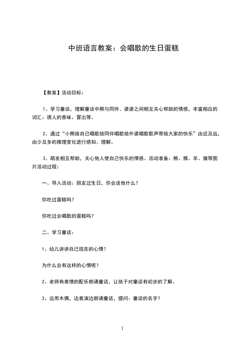三、请几位幼儿手拿木偶,进行表演,其他幼儿和老师共同讲故事,边讲边玩。附:童话会唱歌的生日蛋糕小熊很爱唱歌,他常常边干活边唱歌。外婆的生日到了,小熊心想:我给外婆送点什么?