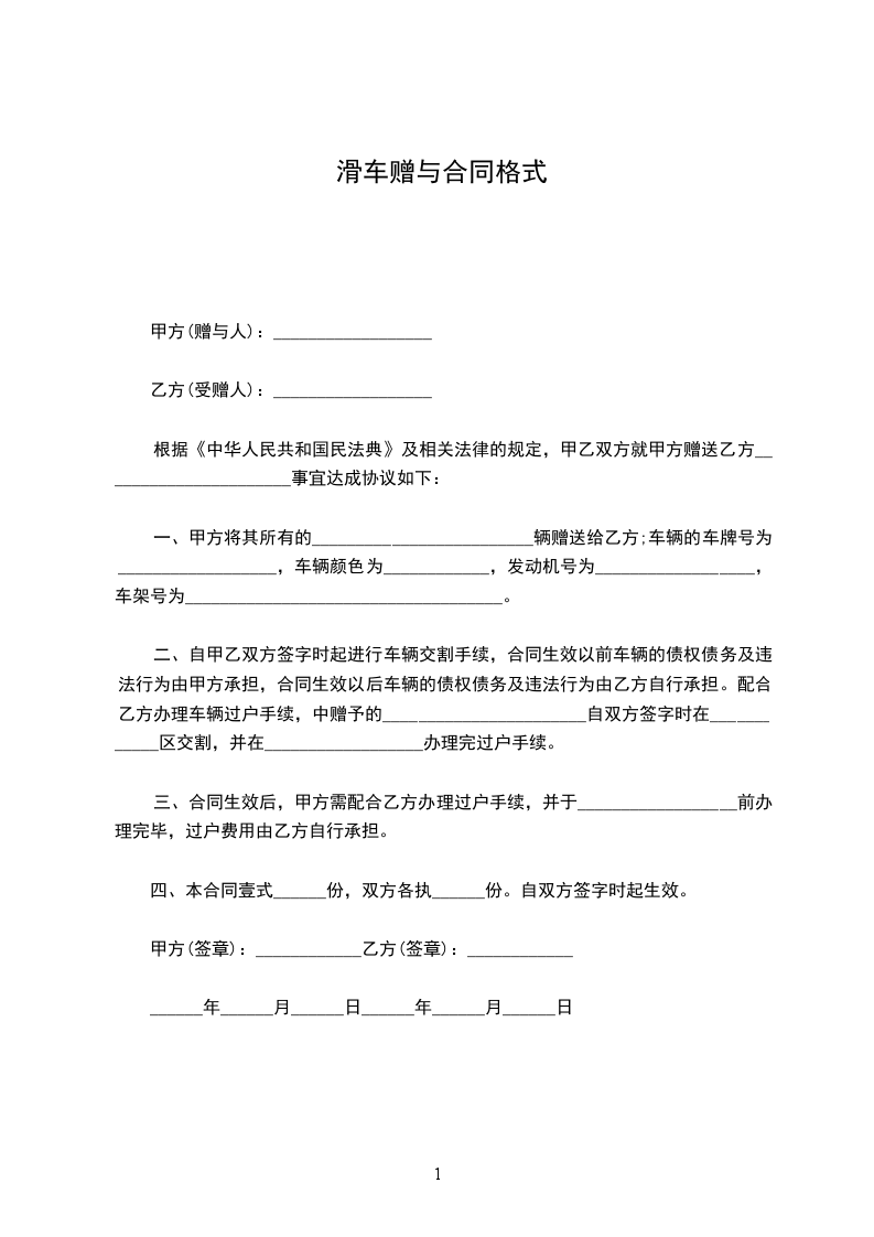 一、甲方将其所有的_________________________辆赠送给乙方;车辆的车牌号为__________________,车辆颜色为____________,发动机号为__________________,车架号为____________________________________。