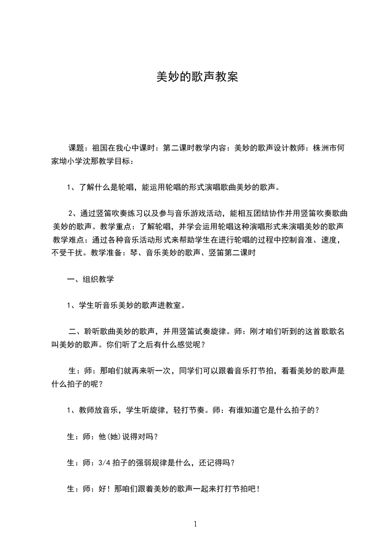二、聆听歌曲美妙的歌声,并用竖笛试奏旋律。师:刚才咱们听到的这首歌歌名叫美妙的歌声。你们听了之后有什么感觉呢?