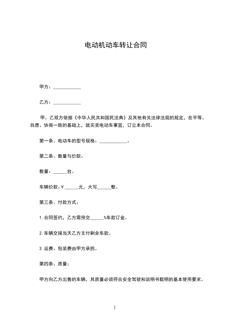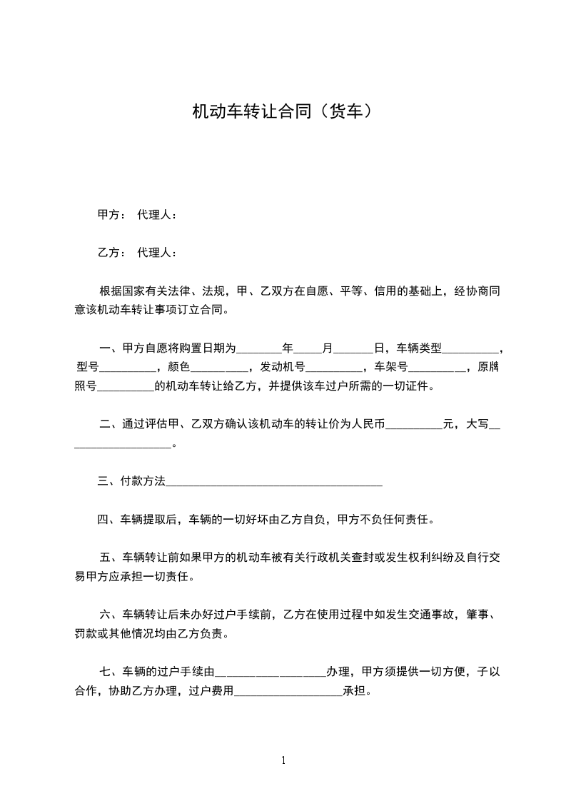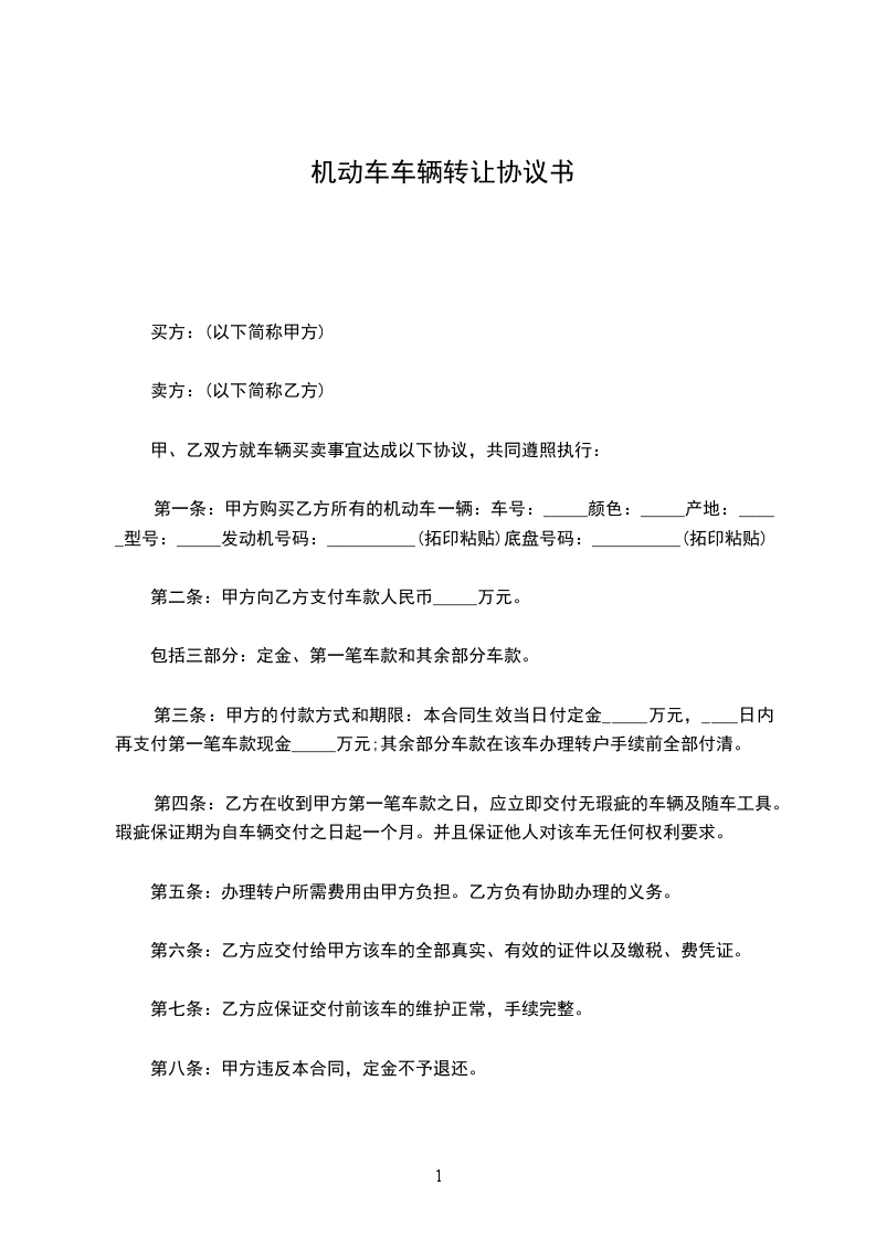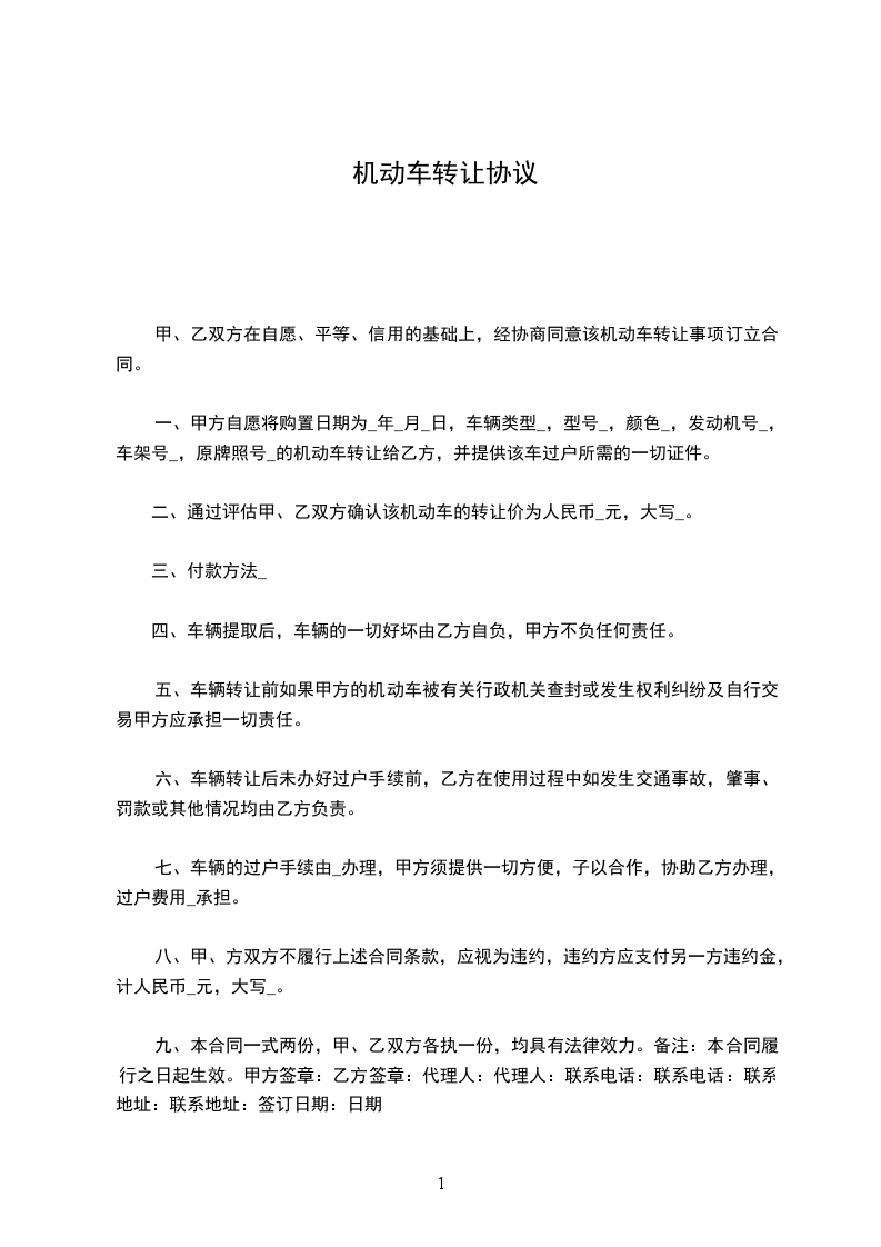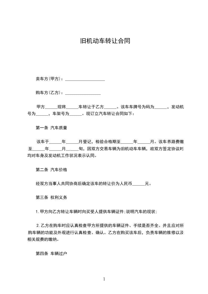 一、甲方自愿将购置日期为________年____月____日,车辆类型__________,型号__________,颜色__________,发动机号__________,车架号__________,原牌照号__________的机动车转让给乙方,并提供该车过户所需的一切证件。