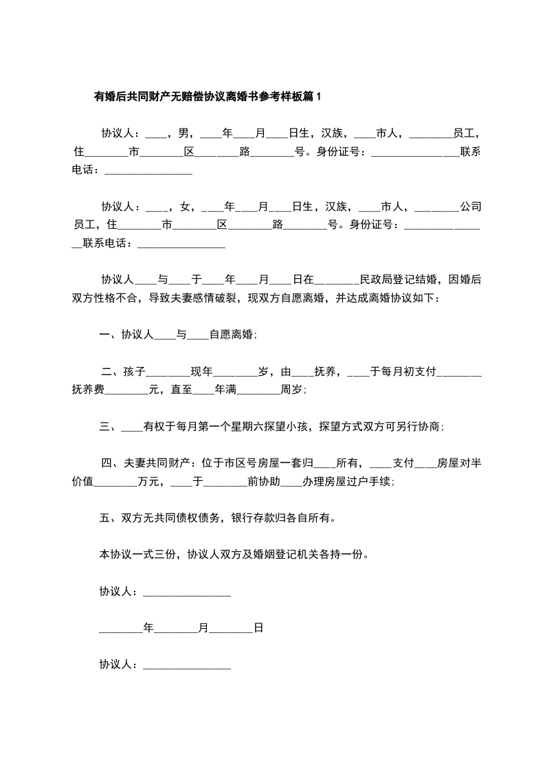 有婚后共同财产无赔偿协议离婚书参考样板篇1