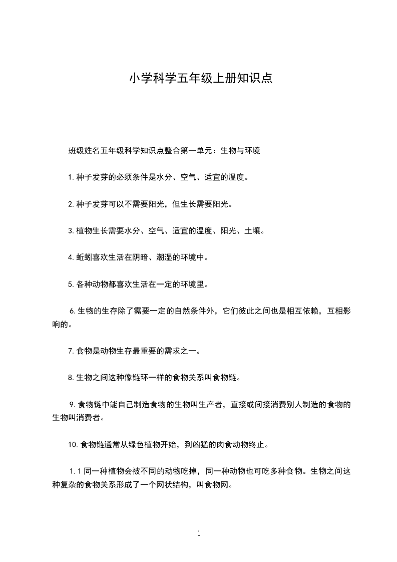 班级姓名五年级科学知识点整合第一单元:生物与环境