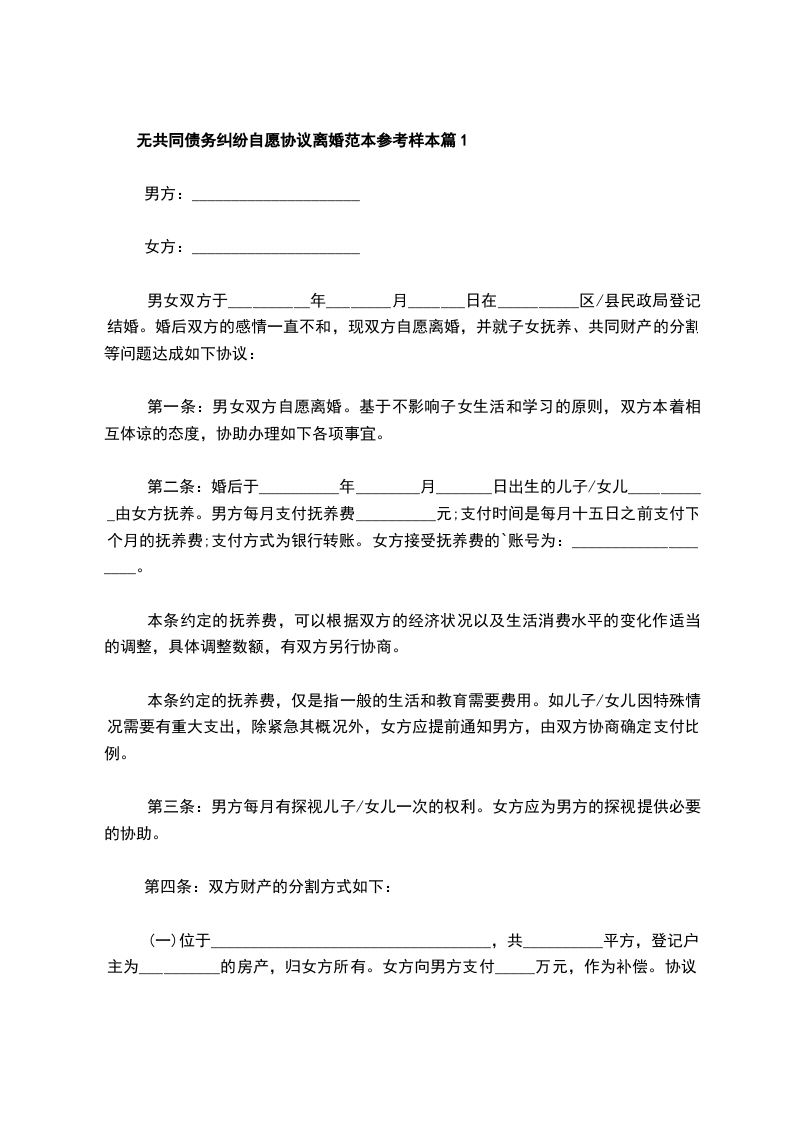无共同债务纠纷自愿协议离婚范本参考样本篇1