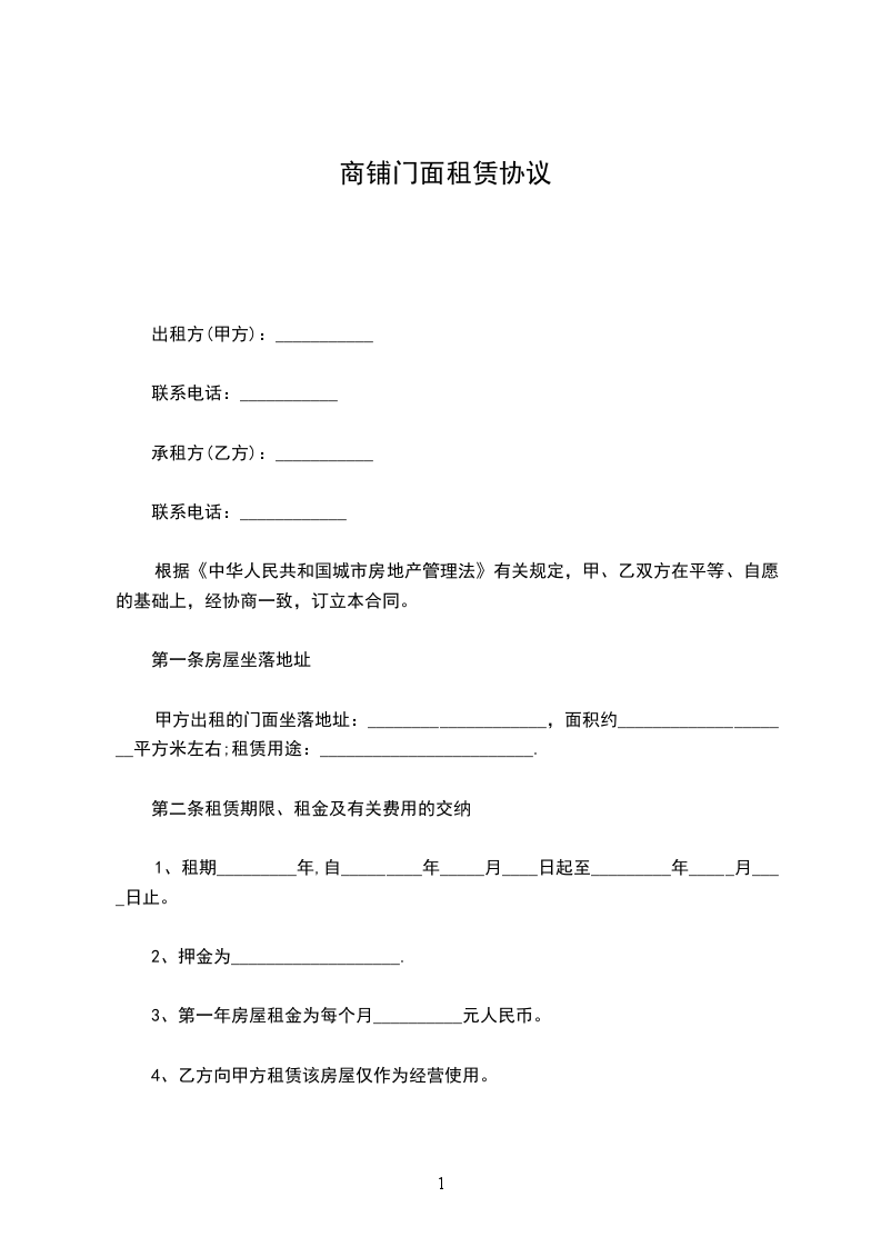 1、甲方将其拥有的座落于街号门面房出租给乙方用于经营。该门面建筑面积共平方米。