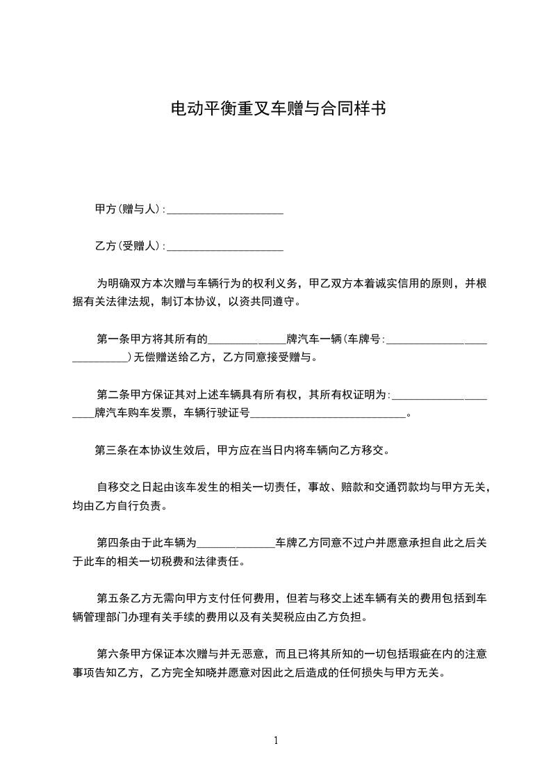 第一条甲方将其所有的______________牌汽车一辆(车牌号:____________________________)无偿赠送给乙方,乙方同意接受赠与。