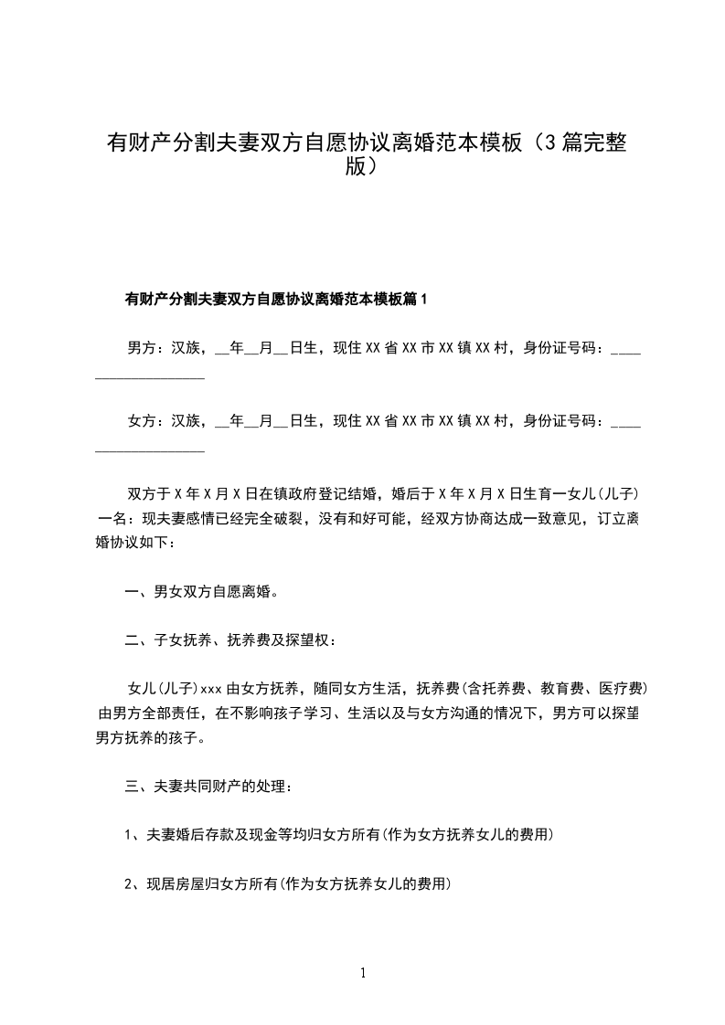 有财产分割双方协商离婚协议参考样板篇1