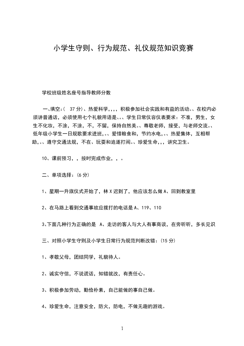 一、填空:(37分)、热爱科学,,,,积极参加社会实践和有益的活动。、在校内必须讲普通话,必须使用七个礼貌用语是、。、学生日常仪容仪表要求:不准,男生,女生不化妆,不涂,不涂,不,不留,保持自然美。、尊敬老师,接受,与老师交流。、低年级小学生一日规歌要求进班,。、爱惜粮食和,节约水电,。、热爱集体,互相帮助,。、遵守交通法规,不在、玩耍和追逐打闹。、珍爱生命,,,讲究卫生。
