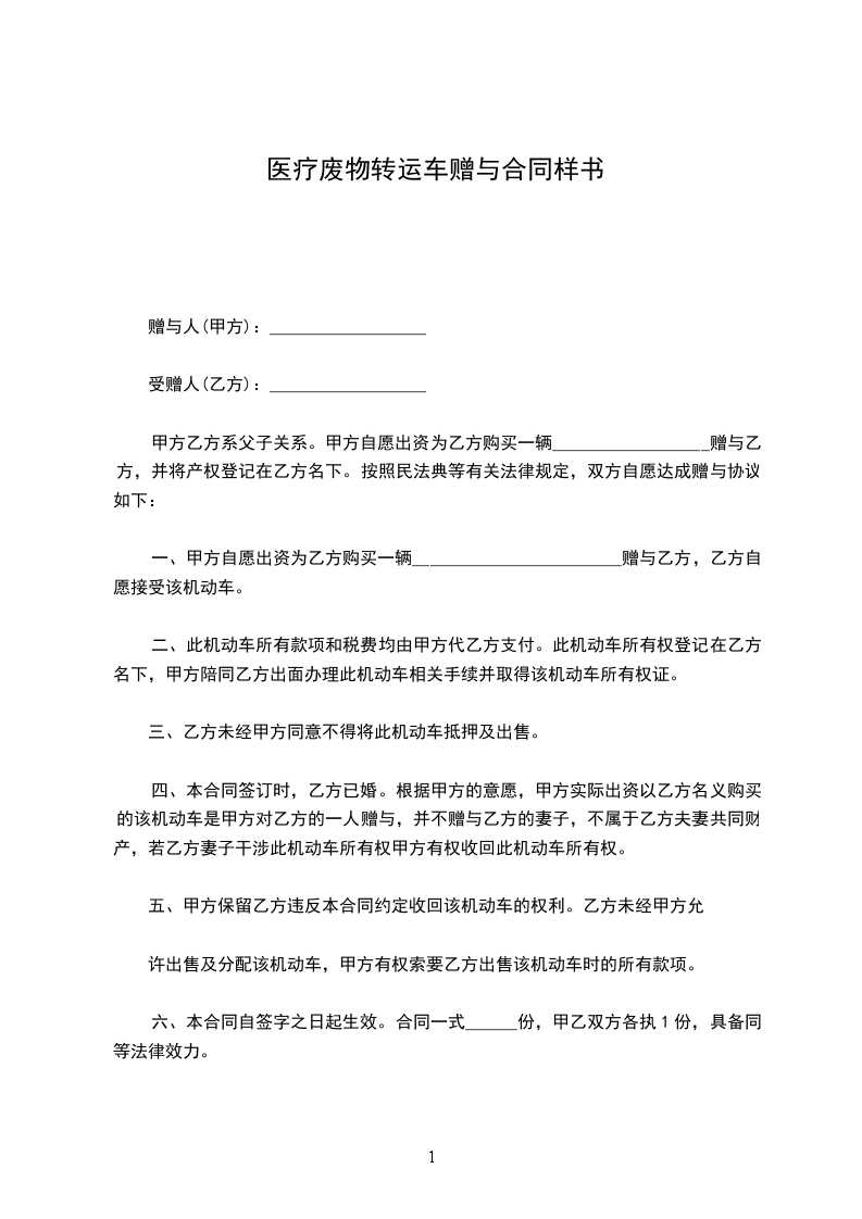 第一条甲方将其所有的__________________牌汽车一辆(车牌号:________________________)无偿赠送给乙方,乙方同意接受赠与。