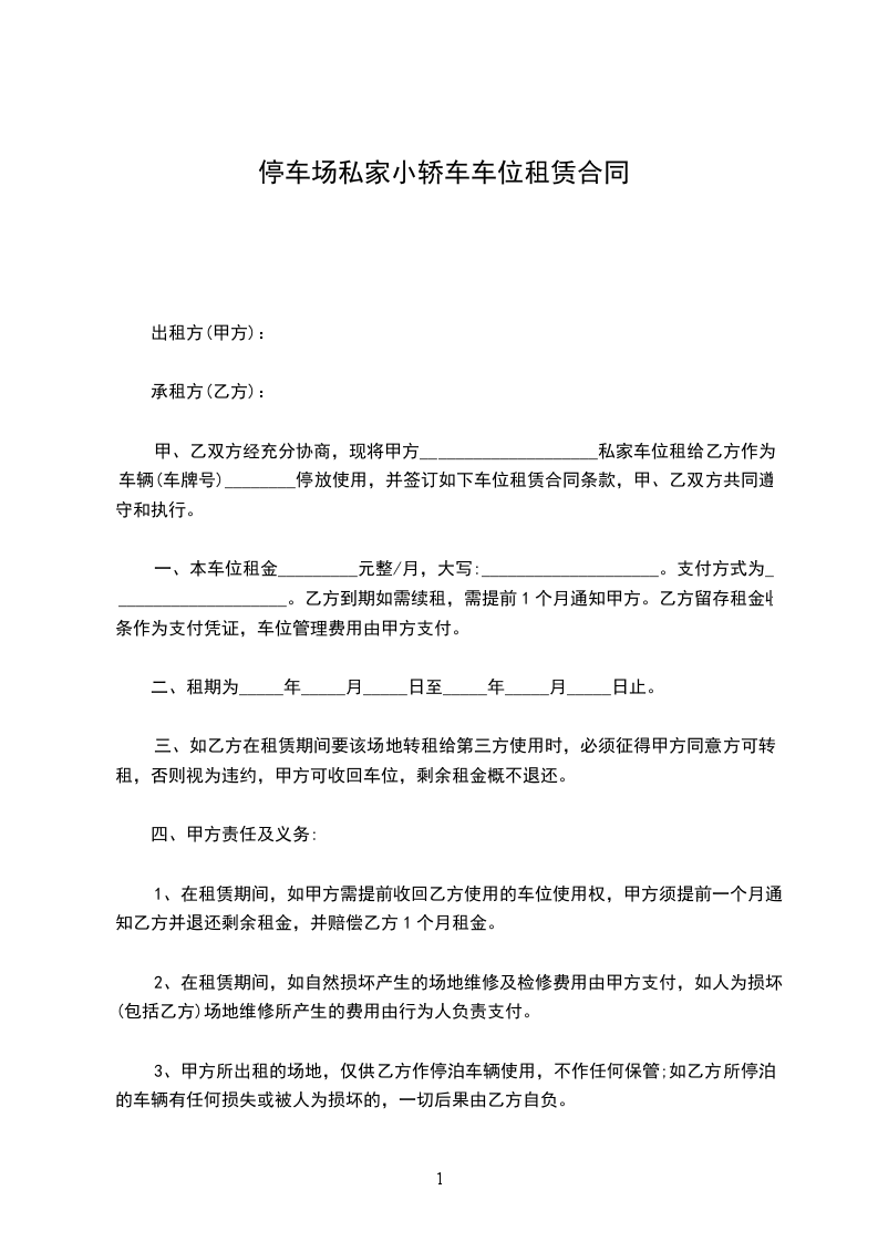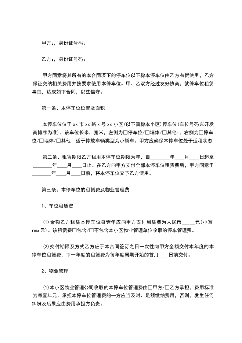本停车位位于xx市xx路x号xx小区(以下简称本小区)停车位(车位号码以开发商排序为准)。该车位长米,宽米,左侧为□停车位/□墙体/□其他:,右侧为□停车位/□墙体/□其他:适于停放车辆类型为小轿车。甲方应确保本停车位处于适租状态。
