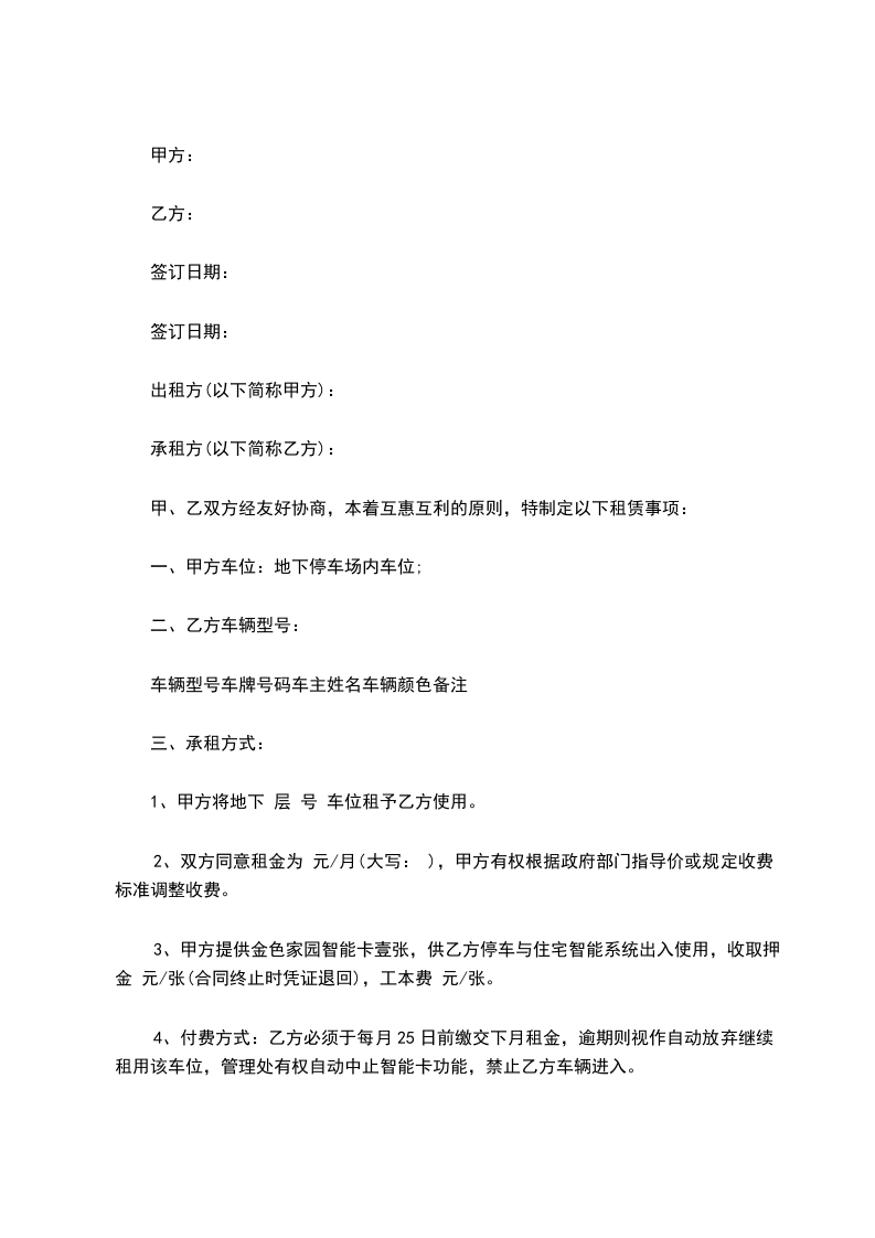 第二条、租赁期限乙方租用本停车位期限为年,自________年____月____日起至________年____月____日止。在乙方向甲方支付全部本停车位租赁费后,甲方同意于________年____月____日前,将本停车位交予乙方使用。