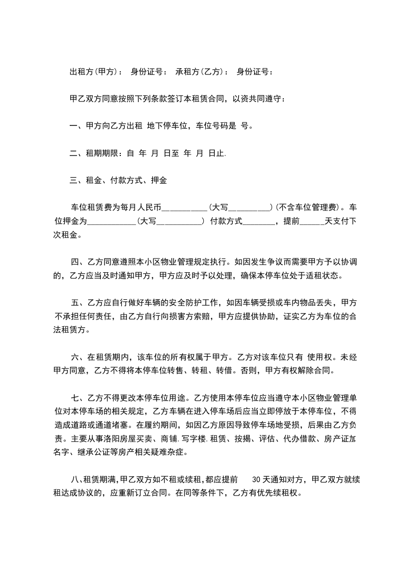 甲方同意将其所有的本合同项下的停车位以下称本停车位由乙方有偿使用,乙方保证交纳相关费用并按要求使用本停车位。甲、乙双方经过友好协商,就停车位租赁事宜,达成如下合同,以兹信守。