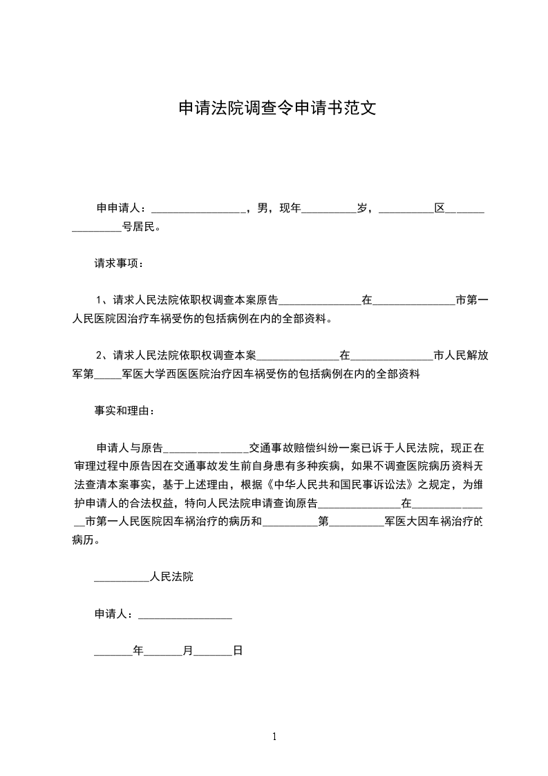 1、请求人民法院依职权调查本案原告_______________在_______________市第一人民医院因治疗车祸受伤的包括病例在内的全部资料。