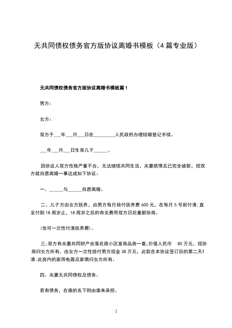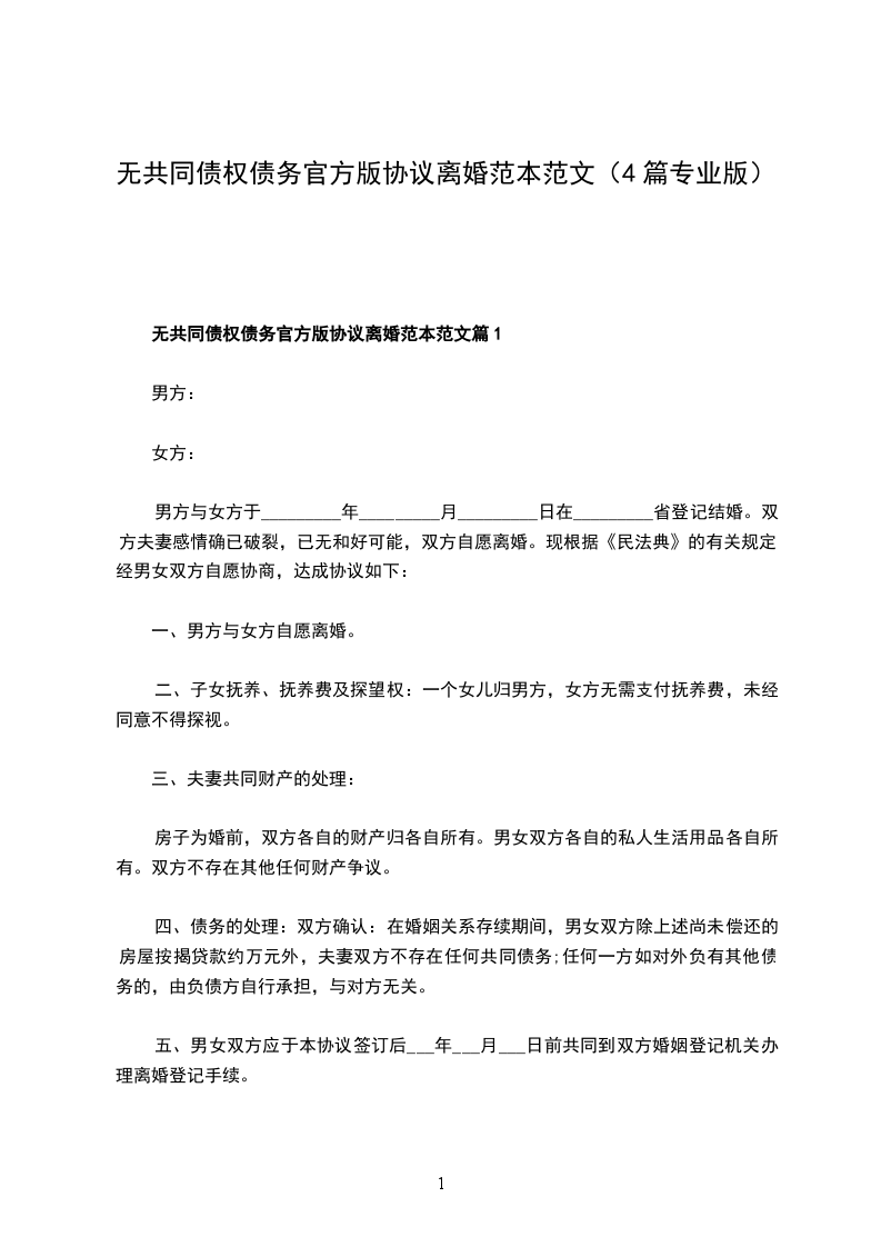 无共同债权债务官方版离婚协议书参考样式篇1