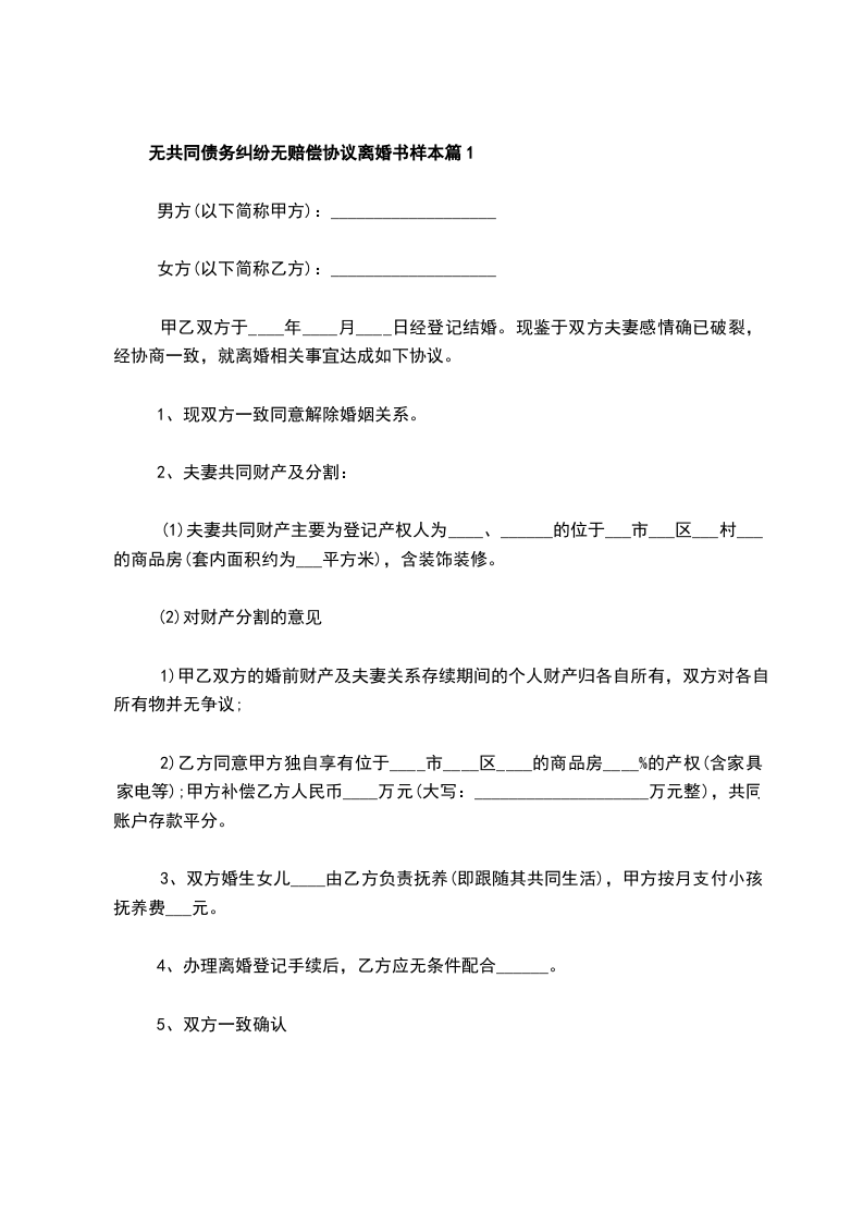 无共同债务纠纷无赔偿协议离婚书样本篇11