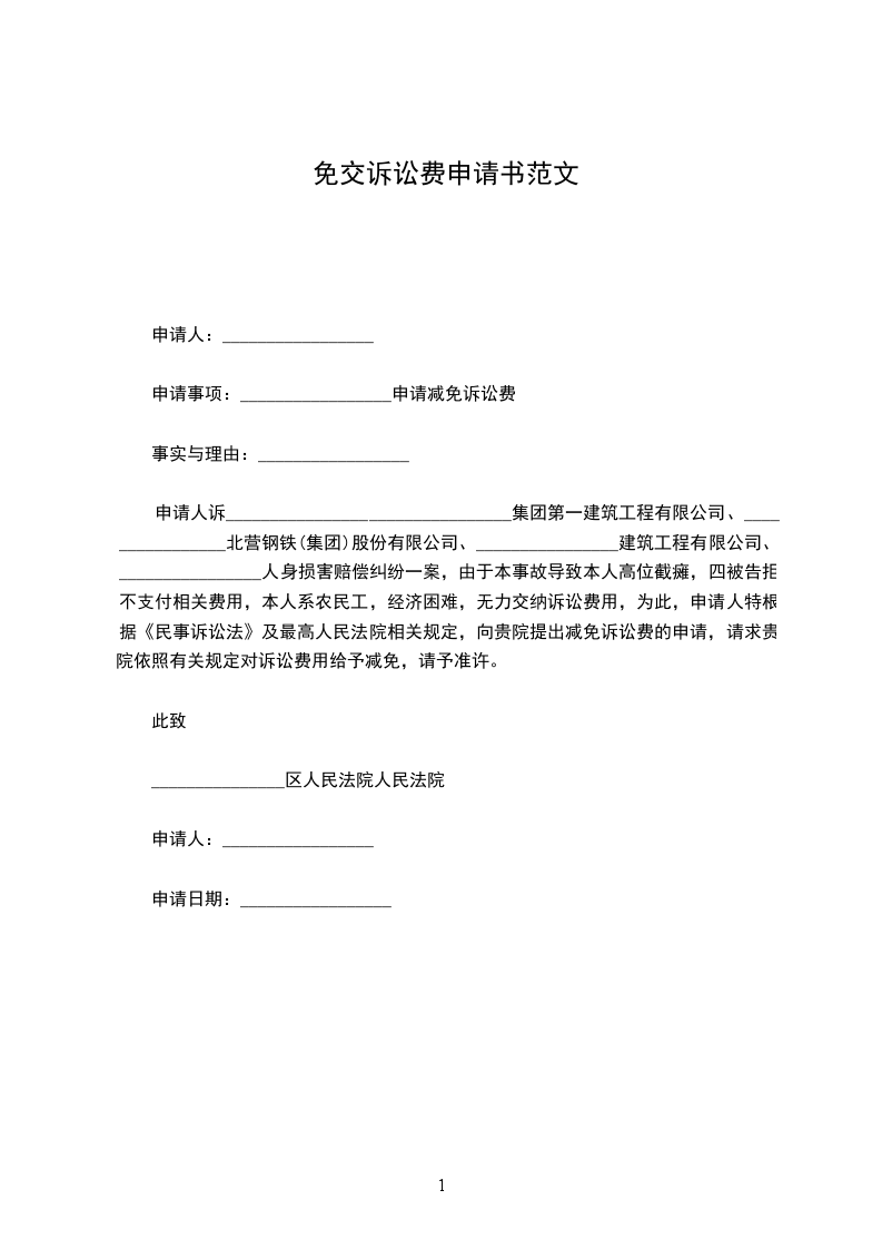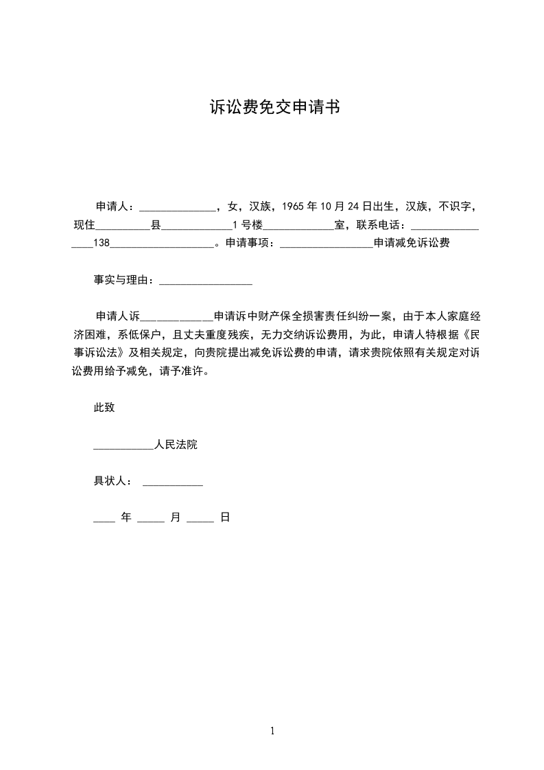 免交诉讼费用申请书