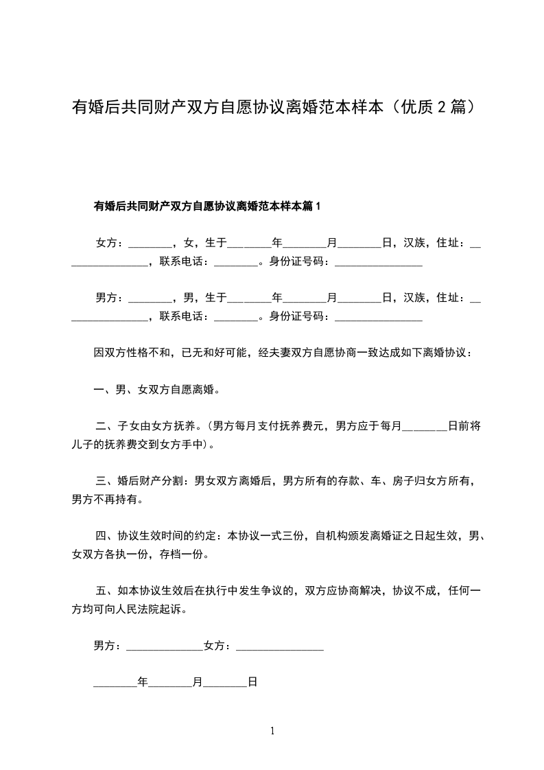 有婚后共同财产双方自愿离婚协议书参考格式篇2