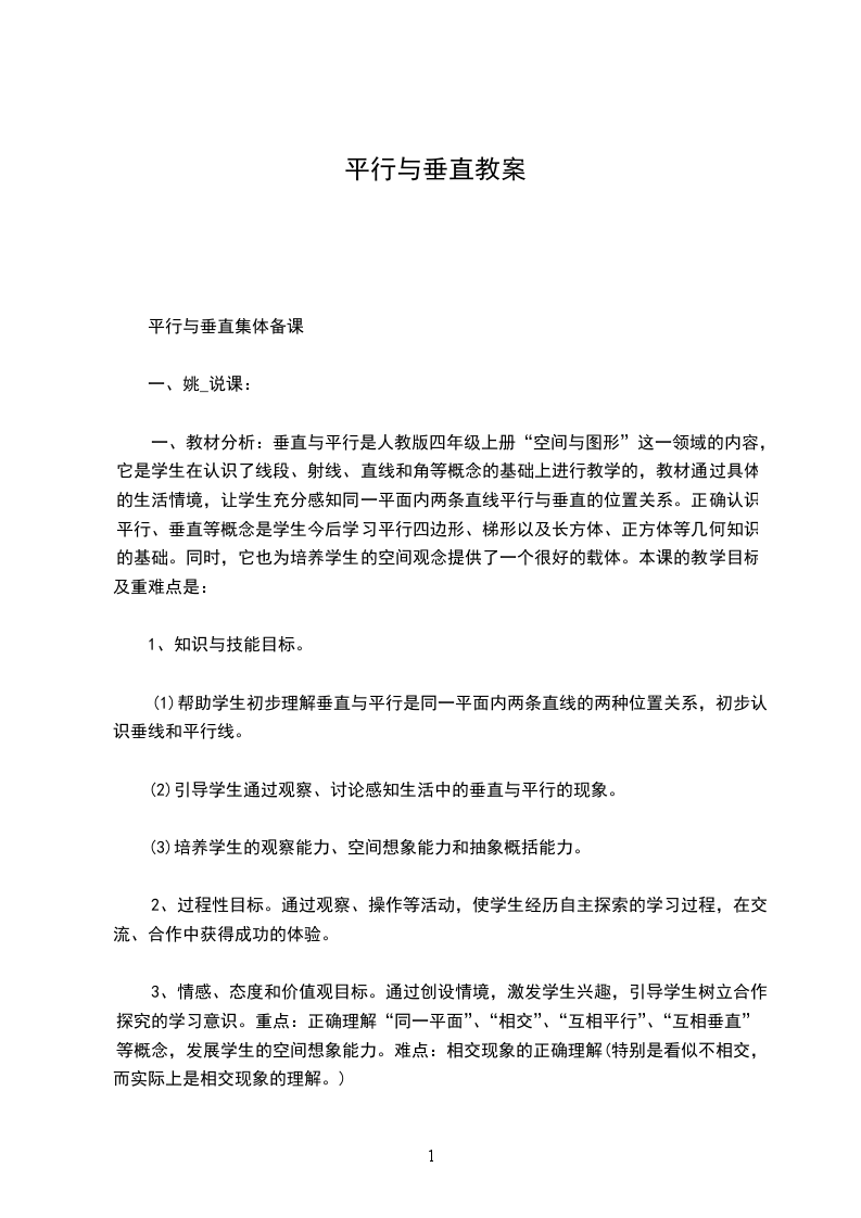 一、教材分析:垂直与平行是人教版四年级上册“空间与图形”这一领域的内容,它是学生在认识了线段、射线、直线和角等概念的基础上进行教学的,教材通过具体的生活情境,让学生充分感知同一平面内两条直线平行与垂直的位置关系。正确认识平行、垂直等概念是学生今后学习平行四边形、梯形以及长方体、正方体等几何知识的基础。同时,它也为培养学生的空间观念提供了一个很好的载体。本课的教学目标及重难点是: