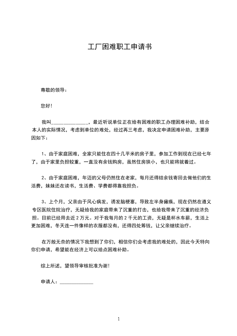 我叫_______________,最近听说单位正在给有困难的职工办理困难补助,结合本人的实际情况,考虑到单位的难处,经过再三考虑,我决定申请困难补助,主要原因如下: