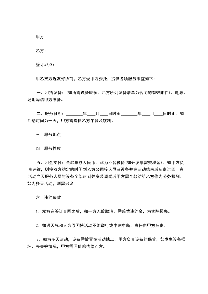 3、如为多天活动,设备需放置在活动地点,甲方负责设备的保管,如发生设备损坏、丢失等情况,甲方需照价赔偿给乙方。